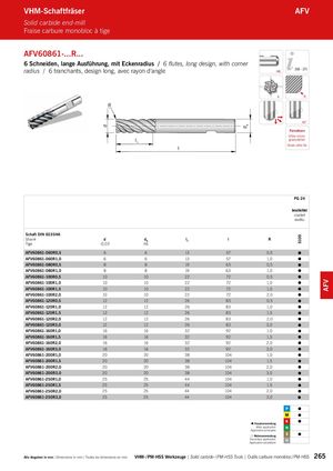 d dA S100 AFV I VHM-Schaftfräser AFV Solid carbide end-mill Fraise carbure monobloc à tige AFV60861-...R... 6 Schneiden, lange Ausführung, mit Eckenradius / 6 flutes, long design, with corner radius / 6 tranchants, design long, avec rayon d‘angle HB 268 – 275 6 R R 45° Feinstkorn Ultra micro I1 granulation Grain ultra fin PG 24 beschichtet coated revêtu Schaft DIN 6535HA Shank d dA l1 l R Tige -0,03 h6 AFV60861-060R0,5 6 6 13 57 0,5 AFV60861-060R1,0 6 6 13 57 1,0 AFV60861-080R0,5 8 8 19 63 0,5 AFV60861-080R1,0 8 8 19 63 1,0 AFV60861-100R0,5 10 10 22 72 0,5 AFV60861-100R1,0 10 10 22 72 1,0 AFV60861-100R1,5 10 10 22 72 1,5 AFV60861-100R2,0 10 10 22 72 2,0 AFV60861-120R0,5 12 12 26 83 0,5 AFV60861-120R1,0 12 12 26 83 1,0 AFV60861-120R1,5 12 12 26 83 1,5 AFV60861-120R2,0 12 12 26 83 2,0 AFV60861-120R3,0 12 12 26 83 3,0 AFV60861-160R1,0 16 16 32 92 1,0 AFV60861-160R1,5 16 16 32 92 1,5 AFV60861-160R2,0 16 16 32 92 2,0 AFV60861-160R3,0 16 16 32 92 3,0 AFV60861-200R1,0 20 20 38 104 1,0 AFV60861-200R1,5 20 20 38 104 1,5 AFV60861-200R2,0 20 20 38 104 2,0 AFV60861-200R3,0 20 20 38 104 3,0 AFV60861-250R1,0 25 25 44 104 1,0 AFV60861-250R1,5 25 25 44 104 1,5 AFV60861-250R2,0 25 25 44 104 2,0 AFV60861-250R3,0 25 25 44 104 3,0 Hauptanwendung Main application Application principale Nebenanwendung Secondary application Application secondaire Alle Angaben in mm / Dimensions in mm / Toutes les dimensions en mm VHM- / PM-HSS Werkzeuge | Solid carbide- / PM-HSS Tools | Outils carbure monobloc / PM-HSS 265