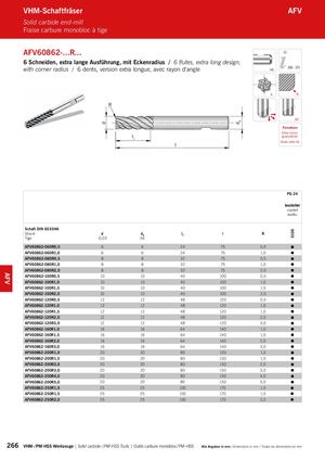 d dA S100 I VHM-Schaftfräser AFV Solid carbide end-mill Fraise carbure monobloc à tige AFV60862-...R... 6 Schneiden, extra lange Ausführung, mit Eckenradius / 6 flutes, extra long design, with corner radius / 6 dents, version extra longue, avec rayon d‘angle HB 268 – 275 6 R R 45° Feinstkorn Ultra micro I1 granulation Grain ultra fin PG 24 beschichtet coated revêtu Schaft DIN 6535HA Shank d dA l1 l R Tige -0,03 h6 AFV60862-060R0,5 6 6 24 75 0,5 AFV60862-060R1,0 6 6 24 75 1,0 AFV60862-080R0,5 8 8 32 75 0,5 AFV60862-080R1,0 8 8 32 75 1,0 AFV60862-080R2,0 8 8 32 75 2,0 AFV60862-100R0,5 10 10 40 100 0,5 AFV60862-100R1,0 10 10 40 100 1,0 AFV60862-100R1,5 10 10 40 100 1,5 AFV60862-100R2,0 10 10 40 100 2,0 AFV60862-120R0,5 12 12 48 120 0,5 AFV60862-120R1,0 12 12 48 120 1,0 AFV60862-120R1,5 12 12 48 120 1,5 AFV60862-120R2,0 12 12 48 120 2,0 AFV60862-120R3,0 12 12 48 120 3,0 AFV60862-160R1,0 16 16 64 140 1,0 AFV60862-160R1,5 16 16 64 140 1,5 AFV60862-160R2,0 16 16 64 140 2,0 AFV60862-160R3,0 16 16 64 140 3,0 AFV60862-200R1,0 20 20 80 150 1,0 AFV60862-200R1,5 20 20 80 150 1,5 AFV60862-200R2,0 20 20 80 150 2,0 AFV60862-200R3,0 20 20 80 150 3,0 AFV60862-200R4,0 20 20 80 150 4,0 AFV60862-200R5,0 20 20 80 150 5,0 AFV60862-250R1,0 25 25 100 170 1,0 AFV60862-250R1,5 25 25 100 170 1,5 AFV60862-250R2,0 25 25 100 170 2,0 266 VHM- / PM-HSS Werkzeuge | Solid carbide- / PM-HSS Tools | Outils carbure monobloc / PM-HSS Alle Angaben in mm / Dimensions in mm / Toutes les dimensions en mm AFV