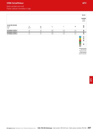S100 AFV VHM-Schaftfräser AFV Solid carbide end-mill Fraise carbure monobloc à tige PG 24 beschichtet coated revêtu Schaft DIN 6535HA Shank d dA l1 l R Tige -0,03 h6 AFV60862-250R3,0 25 25 100 170 3,0 AFV60862-250R4,0 25 25 100 170 4,0 AFV60862-250R5,0 25 25 100 170 5,0 Hauptanwendung Main application Application principale Nebenanwendung Secondary application Application secondaire Alle Angaben in mm / Dimensions in mm / Toutes les dimensions en mm VHM- / PM-HSS Werkzeuge | Solid carbide- / PM-HSS Tools | Outils carbure monobloc / PM-HSS 267
