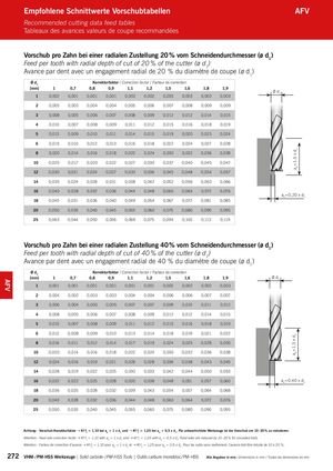 ap=1,5 x d1ap=1,5 x d1 Empfohlene Schnittwerte Vorschubtabellen AFV Recommended cutting data feed tables Tableaux des avances valeurs de coupe recommandées Vorschub pro Zahn bei einer radialen Zustellung 20 % vom Schneidendurchmesser (ø d1) Feed per tooth with radial depth of cut of 20 % of the cutter (ø d1) Avance par dent avec un engagement radial de 20 % du diamètre de coupe (ø d1) Ø d1 Korrekturfaktor / Correction factor / Facteur de correction [mm] 1 0,7 0,8 0,9 1,1 1,2 1,5 1,6 1,8 1,9 Ø d1 1 0,002 0,001 0,001 0,001 0,002 0,002 0,003 0,003 0,003 0,003 2 0,005 0,003 0,004 0,004 0,005 0,006 0,007 0,008 0,009 0,009 3 0,008 0,005 0,006 0,007 0,008 0,009 0,012 0,012 0,014 0,015 4 0,010 0,007 0,008 0,009 0,011 0,012 0,015 0,016 0,018 0,019 5 0,013 0,009 0,010 0,011 0,014 0,015 0,019 0,020 0,023 0,024 6 0,015 0,010 0,012 0,013 0,016 0,018 0,022 0,024 0,027 0,028 8 0,020 0,014 0,016 0,018 0,022 0,024 0,030 0,032 0,036 0,038 10 0,025 0,017 0,020 0,022 0,027 0,030 0,037 0,040 0,045 0,047 12 0,030 0,021 0,024 0,027 0,033 0,036 0,045 0,048 0,054 0,057 14 0,035 0,024 0,028 0,031 0,038 0,042 0,052 0,056 0,063 0,066 16 0,040 0,028 0,032 0,036 0,044 0,048 0,060 0,064 0,072 0,076 ae=0,20 x d1 18 0,045 0,031 0,036 0,040 0,049 0,054 0,067 0,072 0,081 0,085 20 0,050 0,035 0,040 0,045 0,055 0,060 0,075 0,080 0,090 0,095 25 0,063 0,044 0,050 0,056 0,069 0,075 0,094 0,100 0,113 0,119 Vorschub pro Zahn bei einer radialen Zustellung 40 % vom Schneidendurchmesser (ø d1) Feed per tooth with radial depth of cut of 40 % of the cutter (ø d1) Avance par dent avec un engagement radial de 40 % du diamètre de coupe (ø d1) Ø d1 Korrekturfaktor / Correction factor / Facteur de correction [mm] 1 0,7 0,8 0,9 1,1 1,2 1,5 1,6 1,8 1,9 Ø d1 1 0,001 0,001 0,001 0,001 0,001 0,001 0,002 0,002 0,002 0,003 2 0,004 0,002 0,003 0,003 0,004 0,004 0,006 0,006 0,007 0,007 3 0,006 0,004 0,005 0,005 0,007 0,007 0,009 0,010 0,011 0,012 4 0,008 0,005 0,006 0,007 0,008 0,009 0,012 0,012 0,014 0,015 5 0,010 0,007 0,008 0,009 0,011 0,012 0,015 0,016 0,018 0,019 6 0,012 0,008 0,009 0,010 0,013 0,014 0,018 0,019 0,021 0,022 8 0,016 0,011 0,012 0,014 0,017 0,019 0,024 0,025 0,028 0,030 10 0,020 0,014 0,016 0,018 0,022 0,024 0,030 0,032 0,036 0,038 12 0,024 0,016 0,019 0,021 0,026 0,028 0,036 0,038 0,043 0,045 14 0,028 0,019 0,022 0,025 0,030 0,033 0,042 0,044 0,050 0,053 16 0,032 0,022 0,025 0,028 0,035 0,038 0,048 0,051 0,057 0,060 ae=0,40 x d1 18 0,036 0,025 0,028 0,032 0,039 0,043 0,054 0,057 0,064 0,068 20 0,040 0,028 0,032 0,036 0,044 0,048 0,060 0,064 0,072 0,076 25 0,050 0,035 0,040 0,045 0,055 0,060 0,075 0,080 0,090 0,095 Achtung: Vorschub-Korrekturfaktor ➝ Kf fz = 1,10 bei ap = 1 x d1 und ➝ Kf fz = 1,25 bei ap = 0,5 x d1. Für unbeschichtete Werkzeuge ist der Vorschub um 10 - 20 % zu reduzieren. Attention: Feed rate correction factor ➝ Kf fz = 1,10 with ap = 1 x d1 and ➝ Kf fz = 1,25 with ap = 0,5 x d1. Feed rates are reduced by 10 - 20 % for uncoated tools. Attention : Facteur de correction d’avance ➝ Kf fz = 1,10 pour ap = 1 x d1 et ➝ Kf fz = 1,25 pour ap = 0,5 x d1. Pour les outils sans revêtement, l’avance doit être réduite de 10 à 20 %. 272 VHM- / PM-HSS Werkzeuge | Solid carbide- / PM-HSS Tools | Outils carbure monobloc / PM-HSS Alle Angaben in mm / Dimensions in mm / Toutes les dimensions en mm AFV