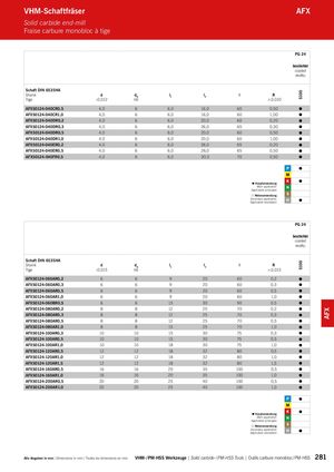 S100S100 AFX VHM-Schaftfräser AFX Solid carbide end-mill Fraise carbure monobloc à tige PG 24 beschichtet coated revêtu Schaft DIN 6535HA Shank d dA l1 l2 l R Tige -0,012 h6 ±0,010 AFX50124-040CR0,5 4,0 6 6,0 16,0 60 0,50 AFX50124-040CR1,0 4,0 6 6,0 16,0 60 1,00 AFX50124-040DR0,2 4,0 6 6,0 20,0 60 0,20 AFX50124-040DR0,3 4,0 6 6,0 26,0 65 0,30 AFX50124-040DR0,5 4,0 6 6,0 20,0 60 0,50 AFX50124-040DR1,0 4,0 6 6,0 20,0 60 1,00 AFX50124-040ER0,2 4,0 6 6,0 26,0 65 0,20 AFX50124-040ER0,5 4,0 6 6,0 26,0 65 0,50 AFX50124-040FR0,5 4,0 6 6,0 30,0 70 0,50 Hauptanwendung Main application Application principale Nebenanwendung Secondary applicationApplication secondaire PG 24 beschichtet coated revêtu Schaft DIN 6535HA Shank d dA l1 l2 l R Tige -0,015 h6 ±0,015 AFX50124-060AR0,2 6 6 9 20 60 0,2 AFX50124-060AR0,3 6 6 9 20 60 0,3 AFX50124-060AR0,5 6 6 9 20 60 0,5 AFX50124-060AR1,0 6 6 9 20 60 1,0 AFX50124-060BR0,5 6 6 15 30 90 0,5 AFX50124-080AR0,2 8 8 12 25 70 0,2 AFX50124-080AR0,3 8 8 12 25 70 0,3 AFX50124-080AR0,5 8 8 12 25 70 0,5 AFX50124-080AR1,0 8 8 15 25 70 1,0 AFX50124-100AR0,3 10 10 15 30 75 0,3 AFX50124-100AR0,5 10 10 15 30 75 0,5 AFX50124-100AR1,0 10 10 18 30 75 1,0 AFX50124-120AR0,5 12 12 18 32 80 0,5 AFX50124-120AR1,0 12 12 18 32 80 1,0 AFX50124-120AR1,5 12 12 18 32 80 1,5 AFX50124-160AR0,5 16 16 20 35 100 0,5 AFX50124-160AR1,0 16 16 20 35 100 1,0 AFX50124-200AR0,5 20 20 25 40 100 0,5 AFX50124-200AR1,0 20 20 25 40 100 1,0 Hauptanwendung Main application Application principale Nebenanwendung Secondary applicationApplication secondaire Alle Angaben in mm / Dimensions in mm / Toutes les dimensions en mm VHM- / PM-HSS Werkzeuge | Solid carbide- / PM-HSS Tools | Outils carbure monobloc / PM-HSS 281
