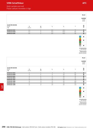 S100S100 VHM-Schaftfräser AFX Solid carbide end-mill Fraise carbure monobloc à tige PG 24 beschichtet coated revêtu Schaft DIN 6535HA Shank d dA l1 l2 l Tige -0,012 h6 AFX50122-050C 5,0 6 8,0 35,0 75 AFX50122-050D 5,0 6 8,0 40,0 80 AFX50122-050E 5,0 6 8,0 50,0 90 Hauptanwendung Main application Application principale Nebenanwendung Secondary application Application secondaire PG 24 beschichtet coated revêtu Schaft DIN 6535HA Shank d dA l1 l2 l Tige -0,015 h6 AFX50122-060A 6 6 9 15 60 AFX50122-060B 6 6 9 20 60 AFX50122-060C 6 6 9 30 70 AFX50122-080A 8 8 12 25 70 AFX50122-100A 10 10 15 30 75 AFX50122-100B 10 10 15 45 100 AFX50122-120A 12 12 20 35 80 AFX50122-120B 12 12 20 50 110 Hauptanwendung Main application Application principale Nebenanwendung Secondary application Application secondaire 290 VHM- / PM-HSS Werkzeuge | Solid carbide- / PM-HSS Tools | Outils carbure monobloc / PM-HSS Alle Angaben in mm / Dimensions in mm / Toutes les dimensions en mm AFX