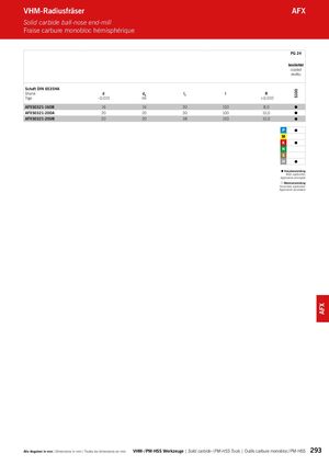 S100 AFX VHM-Radiusfräser AFX Solid carbide ball-nose end-mill Fraise carbure monobloc hémisphérique PG 24 beschichtet coated revêtu Schaft DIN 6535HA Shank d dA l1 l R Tige -0,015 h6 ±0,010 AFX50321-160B 16 16 30 150 8,0 AFX50321-200A 20 20 30 100 10,0 AFX50321-200B 20 20 38 150 10,0 Hauptanwendung Main application Application principale Nebenanwendung Secondary application Application secondaire Alle Angaben in mm / Dimensions in mm / Toutes les dimensions en mm VHM- / PM-HSS Werkzeuge | Solid carbide- / PM-HSS Tools | Outils carbure monobloc / PM-HSS 293