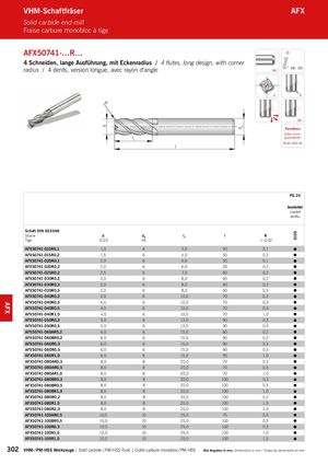 d dA S100 l VHM-Schaftfräser AFX Solid carbide end-mill Fraise carbure monobloc à tige AFX50741-…R… 4 Schneiden, lange Ausführung, mit Eckenradius / 4 flutes, long design, with corner radius / 4 dents, version longue, avec rayon d‘angle HA 310 – 325 4 R 30° Feinstkorn Ultra micro l1 granulation Grain ultra fin PG 24 beschichtet coated revêtu Schaft DIN 6535HA Shank d dA l1 l R Tige -0,03 h6 ± 0,02 AFX50741-010R0,1 1,0 6 2,5 50 0,1 AFX50741-015R0,2 1,5 6 4,0 50 0,2 AFX50741-020R0,1 2,0 6 6,0 50 0,1 AFX50741-020R0,2 2,0 6 6,0 50 0,2 AFX50741-025R0,2 2,5 6 7,0 60 0,2 AFX50741-030R0,2 3,0 6 8,0 60 0,2 AFX50741-030R0,3 3,0 6 8,0 60 0,3 AFX50741-030R0,5 3,0 6 8,0 60 0,5 AFX50741-040R0,2 4,0 6 10,0 70 0,2 AFX50741-040R0,3 4,0 6 10,0 70 0,3 AFX50741-040R0,5 4,0 6 10,0 70 0,5 AFX50741-040R1,0 4,0 6 10,0 70 1,0 AFX50741-050R0,3 5,0 6 13,0 90 0,3 AFX50741-050R0,5 5,0 6 13,0 90 0,5 AFX50741-060AR0,2 6,0 6 15,0 60 0,2 AFX50741-060BR0,2 6,0 6 15,0 90 0,2 AFX50741-060R0,3 6,0 6 15,0 90 0,3 AFX50741-060R0,5 6,0 6 15,0 90 0,5 AFX50741-060R1,0 6,0 6 15,0 90 1,0 AFX50741-080AR0,3 8,0 8 20,0 70 0,3 AFX50741-080AR0,5 8,0 8 20,0 70 0,5 AFX50741-080AR1,0 8,0 8 20,0 70 1,0 AFX50741-080BR0,3 8,0 8 20,0 100 0,3 AFX50741-080BR0,5 8,0 8 20,0 100 0,5 AFX50741-080BR1,0 8,0 8 20,0 100 1,0 AFX50741-080R0,2 8,0 8 20,0 100 0,2 AFX50741-080R1,5 8,0 8 20,0 100 1,5 AFX50741-080R2,0 8,0 8 20,0 100 2,0 AFX50741-100AR0,5 10,0 10 25,0 75 0,5 AFX50741-100BR0,5 10,0 10 25,0 100 0,5 AFX50741-100R0,3 10,0 10 25,0 100 0,3 AFX50741-100R1,0 10,0 10 25,0 100 1,0 AFX50741-100R1,5 10,0 10 25,0 100 1,5 302 VHM- / PM-HSS Werkzeuge | Solid carbide- / PM-HSS Tools | Outils carbure monobloc / PM-HSS Alle Angaben in mm / Dimensions in mm / Toutes les dimensions en mm AFX