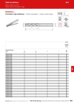 d dA S100 AFX l VHM-Schaftfräser AFX Solid carbide end-mill Fraise carbure monobloc à tige AFX50141-… 4 Schneiden, lange Ausführung / 4 flutes, long design / 4 dents, version longue HA 310 – 325 30° 4 Feinstkorn Ultra micro granulation Grain ultra fin l1 PG 24 beschichtet coated revêtu Schaft DIN 6535HA Shank d dA l1 l Tige -0,03 h6 AFX50141-010A 1,0 6 3 60 AFX50141-010B 1,0 6 4 60 AFX50141-010C 1,0 6 5 60 AFX50141-010D 1,0 6 6 60 AFX50141-015A 1,5 6 6 60 AFX50141-020A 2,0 6 8 60 AFX50141-020B 2,0 6 10 60 AFX50141-020C 2,0 6 12 60 AFX50141-020D 2,0 6 14 60 AFX50141-025A 2,5 6 10 60 AFX50141-025B 2,5 6 12 60 AFX50141-030A 3,0 6 10 70 AFX50141-030B 3,0 6 12 70 AFX50141-030C 3,0 6 16 70 AFX50141-030D 3,0 6 20 70 AFX50141-030E 3,0 6 26 70 AFX50141-030F 3,0 6 30 70 AFX50141-040A 4,0 6 12 70 AFX50141-040B 4,0 6 16 70 AFX50141-040C 4,0 6 20 70 AFX50141-040D 4,0 6 26 70 AFX50141-040E 4,0 6 30 70 AFX50141-050A 5,0 6 20 70 AFX50141-050B 5,0 6 25 70 AFX50141-050C 5,0 6 30 80 AFX50141-060A 6,0 6 15 60 AFX50141-060B 6,0 6 20 70 AFX50141-060C 6,0 6 20 90 AFX50141-060D 6,0 6 25 75 AFX50141-060E 6,0 6 30 80 AFX50141-060F 6,0 6 30 100 AFX50141-060G 6,0 6 35 90 AFX50141-060H 6,0 6 40 90 Alle Angaben in mm / Dimensions in mm / Toutes les dimensions en mm VHM- / PM-HSS Werkzeuge | Solid carbide- / PM-HSS Tools | Outils carbure monobloc / PM-HSS 305