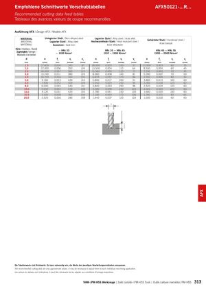 0,2 x d AFX Empfohlene Schnittwerte Vorschubtabellen AFX50121-...R... Recommended cutting data feed tables Tableaux des avances valeurs de coupe recommandées Ausführung AFX / Design AFX / Modèle AFX MATERIALMATERIALMATÉRIAU Unlegierter Stahl / Non-alloyed steel Legierter Stahl / Alloy steel / Acier alliéLegierter Stahl / Alloy steelHochwarmfester Stahl / Heat resistant steel /Gusseisen / Cast ironAcier réfractaireGehärteter Stahl / Hardened steel /Acier trempé Härte / Hardness / DuretéZugfestigkeit / Strengh /Résistance à la traction~ HRc 35~ 1100 N/mm² HRc 35 ~ HRc 45 HRc 45 ~ HRc 551110 ~ 1500 N/mm²1500 ~ 2000 N/mm² d n fz vf vc n fz vf vc n fz vf vc (mm) (U/min) (mm) (mm/min) (m/min) (U/min) (mm) (mm/min) (m/min) (U/min) (mm) (mm/min) (m/min) 1,0 27.600 0,004 240 87 18.000 0,003 100 57 11.000 0,003 60 35 1,5 22.000 0,006 250 104 13.500 0,004 110 64 8.500 0,004 60 40 2,0 18.000 0,007 260 113 11.560 0,005 120 73 7.200 0,005 70 45 3,0 13.240 0,011 280 125 8.560 0,008 140 81 5.280 0,007 70 50 4,0 10.720 0,016 340 135 6.820 0,012 170 86 4.300 0,009 80 54 5,0 9.160 0,023 420 144 5.800 0,017 200 91 3.800 0,013 100 60 6,0 7.900 0,032 500 149 5.040 0,025 250 95 3.280 0,018 120 62 8,0 6.000 0,045 540 151 3.800 0,033 250 96 2.520 0,024 120 63 10,0 5.040 0,054 540 158 3.280 0,038 250 103 2.020 0,030 120 63 12,0 4.120 0,051 420 155 2.780 0,041 230 105 1.680 0,030 100 63 16,0 3.100 0,058 360 156 2.100 0,040 170 106 1.280 0,031 80 64 20,0 2.520 0,056 280 158 1.640 0,037 120 103 1.000 0,030 60 63 d Die Tabellenwerte sind Richtwerte. Es kann notwendig sein, die Werte den jeweiligen Bearbeitungsumständen anzupassen. The recommended cutting data are only approximate values. It may be necessary to adjust them to each individual machining application. Les valeurs du tableau sont indicatives. Il peut être nécessaire de les adapter aux conditions d’usinage respectives. VHM- / PM-HSS Werkzeuge | Solid carbide- / PM-HSS Tools | Outils carbure monobloc / PM-HSS 313