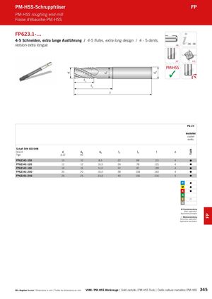 d d3 dA TiAlN FP l PM-HSS-Schruppfräser FP PM-HSS roughing end-mill Fraise d‘ébauche-PM-HSS FP623.1-… 4-5 Schneiden, extra lange Ausführung / 4-5 flutes, extra long design / 4 - 5 dents, version extra longue HB 346 – 350 30° 4-5 PM-HSS ✓ l1 l2 PG 24 beschichtet coated revêtu Schaft DIN 6535HB Shank d dA d3 l1 l2 l z Tige js12 h6 FP62341-100 10 10 8,5 22 69 110 4 FP62341-120 12 12 10,5 26 78 125 4 FP62341-160 16 16 14,0 32 87 138 4 FP62341-200 20 20 18,0 38 108 160 4 FP62351-250 25 25 23,0 45 155 216 5 Hauptanwendung Main application Application principale Nebenanwendung Secondary application Application secondaire Alle Angaben in mm / Dimensions in mm / Toutes les dimensions en mm VHM- / PM-HSS Werkzeuge | Solid carbide- / PM-HSS Tools | Outils carbure monobloc / PM-HSS 345
