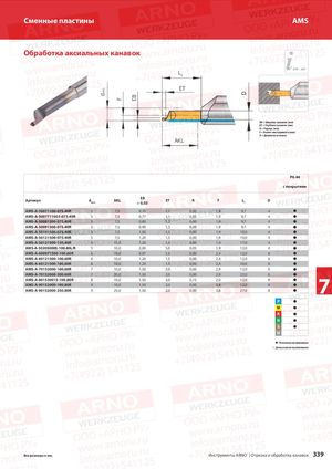 dmin F EB D Сменные пластины AMS Обработка аксиальных канавок 345 – 347 L1 ET EB = Ширина канавки (мм) ET = Глубина канавки (мм) R = Радиус (мм) F = Вылет инструмента (мм) D = Диаметр вставки AKL PG 44 с покрытием Артикул dмин AKL EB+ 0,03 ET R F L1 D AMS-A-50071100-075.40R 5 7,5 0,70 1,1 0,00 1,9 9,7 4 AMS-A-5007711005-075.40R 5 7,5 0,77 1,1 0,05 1,9 9,7 4 AMS-A-50081200-075.40R 5 7,5 0,80 1,2 0,00 1,9 9,7 4 AMS-A-50091300-075.40R 5 7,5 0,90 1,3 0,00 1,9 9,7 4 AMS-A-50101500-075.40R 5 7,5 1,00 1,5 0,00 1,9 10,0 4 AMS-A-50121500-075.40R 5 7,5 1,20 1,5 0,00 1,9 10,0 4 AMS-A-50121500-150.40R 5 15,0 1,20 1,5 0,00 1,9 17,0 4 AMS-A-502050005-100.40L/R 5 10,0 2,00 5,0 0,05 1,9 12,0 4 AMS-A-600971500-100.60R 6 10,0 0,97 1,5 0,00 2,4 12,0 6 AMS-A-60121500-100.60R 6 10,0 1,20 1,5 0,00 2,4 12,0 6 AMS-A-60121500-180.60R 6 18,0 1,20 1,5 0,00 2,4 20,0 6 AMS-A-70152000-100.60R 7 10,0 1,50 2,0 0,00 2,9 12,0 6 AMS-A-70152000-200.60R 7 20,0 1,50 2,0 0,00 2,9 22,0 6 AMS-A-801530015-100.80R 8 10,0 1,50 3,0 0,15 2,0 12,0 8AMS-A-90152000-100.80R910,01,502,00,003,812,08AMS-A-90152000-250.80R925,01,502,00,003,827,087 Основное применение Допустимое применение Все размеры в мм. Инструменты ARNO® | Отрезка и обработка канавок 339