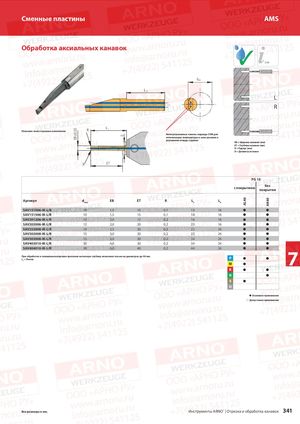 EB±0,02 D AL40 AK40 Сменные пластины AMS Обработка аксиальных канавок ✓ 346 dmin L4 L R Показано левостороннее исполнение R L1 Интегрированные каналы подвода СОЖ для оптимизации температуры в зоне резания и улучшения отвода стружки. EB = Ширина канавки (мм) ET = Глубина канавки (мм) R = Радиус (мм) D = Диаметр вставки R ET PG 19 с покрытием безпокрытия Артикул dмин EB ET R L1 L4 SAV151006-IK-L/R 10 1,5 10 0,1 13 16 SAV151506-IK-L/R 10 1,5 15 0,1 18 16 SAV201206-IK-L/R 12 2,0 12 0,2 16 16 SAV202006-IK-L/R 12 2,0 20 0,2 23 16 SAV252008-IK-L/R 15 2,5 20 0,2 22 24 SAV302008-IK-L/R 15 3,0 20 0,2 22 24 SAV303008-IK-L/R 15 3,0 30 0,2 34 24 SAV403010-IK-L/R 30 4,0 30 0,2 34 24 SAV404010-IK-L/R 30 4,0 40 0,2 44 24 При обработке в сплошном материале врезание на полную глубину возможно только на диаметрах до 50 мм.L4 = Лыска 7 Основное применение Допустимое применение Все размеры в мм. Инструменты ARNO® | Отрезка и обработка канавок 341