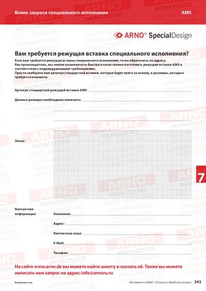 Бланк запроса специального исполнения AMS ARNO® SpecialDesign Вам требуется режущая вставка специального исполнения? Если вам требуется режущая вставка специального исполнения, то вы обратились по адресу. Как производитель, мы имеем возможность быстро и качественно изготовить режущие вставки AMS в соответствии с индивидуальными требованиями. Просто сообщите нам артикул стандартной вставки, которая будет взята за основу, и размеры, которые требуется изменить: Артикул стандартной режущей вставки AMS-������������������������������������������������������������������������������������������ Данные размеры необходимо изменить: ������������������������������������������������������������������������������������������������ ������������������������������������������������������������������������������������������������������������������������� ������������������������������������������������������������������������������������������������������������������������� ������������������������������������������������������������������������������������������������������������������������� Эскиз: 7 Контактная информация Компания: ��������������������������������������������������������������������������������������������������������� Адрес: �������������������������������������������������������������������������������������������������������������� Контактное лицо: ����������������������������������������������������������������������������������������������� E-Mail: ��������������������������������������������������������������������������������������������������������������� Телефон: ����������������������������������������������������������������������������������������������������������� На сайте www.arno.de вы можете найти анкету и скачать её. Также вы можете написать нам запрос на адрес: info@arnoru.ru Все размеры в мм. Инструменты ARNO® | Отрезка и обработка канавок 343