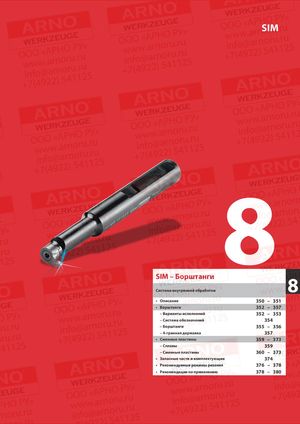 SIM 8 SIM – Борштанги Система внутренней обработки 8 • Описание 350 – 351 • Борштанги 352 – 357 – Варианты исполнений 352 – 353 – Система обозначений 354 – Борштанги 355 – 356 – 4-гранная державка 357 • Сменные пластины 359 – 373 – Сплавы 359 – Сменные пластины 360 – 373 • Запасные части и комплектующие 374 • Рекомендуемые режимы резания 376 – 378 • Рекомендации по применению 378 – 380
