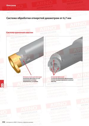 Описание Система обработки отверстий диаметром от 6,7 мм Система крепления пластин Угловые уступы для фиксации 3-точечная фиксация Усиленная фиксация за счет 3-точечная фиксация обеспечивает применения системы точное позиционирование сменных закрепления с уступами. пластин. 8 350 Инструменты ARNO® | Отрезка и обработка канавок
