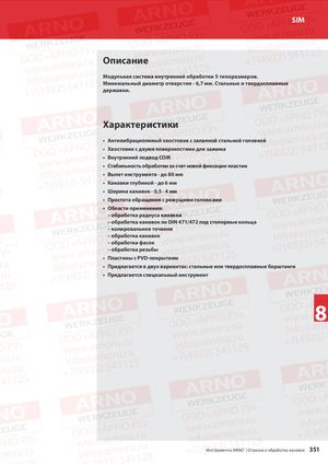 SIM Описание Модульная система внутренней обработки 5 типоразмеров. Минимальный диаметр отверстия - 6,7 мм. Стальные и твердосплавные державки. Характеристики • Антивибрациолнный хвостовик с запаяной стальной головкой • Хвостовик с двумя поверхностями для зажима • Внутренний подвод СОЖ • Стабильность обработки за счет новой фиксации пластин • Вылет инструмента - до 80 мм • Канавки глубиной - до 6 мм • Ширина канавок - 0,5 - 4 мм • Простота обращения с режущими головками • Области применения: – обработка радиуса канавки – обработка канавок по DIN 471/472 под стопорные кольца – копировальное точение – обработка канавок – обработка фасок – обработка резьбы • Пластины с PVD-покрытием • Предлагается в двух вариантах: стальные или твердосплавные борштанги • Предлагается специальный инструмент 8 Инструменты ARNO® | Отрезка и обработка канавок 351