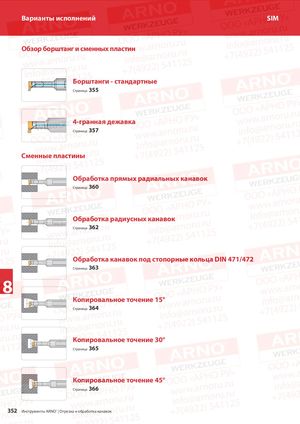 Варианты исполнений SIM Обзор борштанг и сменных пластин Борштанги - стандартные Страница 355 4-гранная дежавка Страница 357 Сменные пластины Обработка прямых радиальных канавок Страница 360 R Обработка радиусных канавок Страница 362 R Обработка канавок под стопорные кольца DIN 471/472 Страница 363 R 8 Копировальное точение 15° Страница 364 R Копировальное точение 30° Страница 365 R Копировальное точение 45° Страница 366 R 352 Инструменты ARNO® | Отрезка и обработка канавок