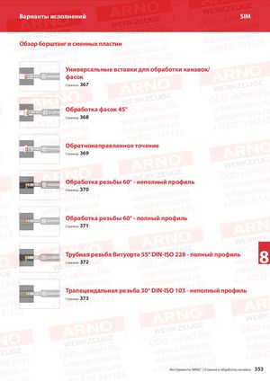 Варианты исполнений SIM Обзор борштанг и сменных пластин Универсальные вставки для обработки канавок/ фасок R Страница 367 Обработка фасок 45° Страница 368 R Обратнонаправленное точение Страница 369 R Обработка резьбы 60° - неполный профиль Страница 370 R Обработка резьбы 60° - полный профиль Страница 371 R Трубная резьба Витуорта 55° DIN-ISO 228 - полный профильСтраница 372 8 R Трапецеидальная резьба 30° DIN-ISO 103 - неполный профиль Страница 373 R Инструменты ARNO® | Отрезка и обработка канавок 353
