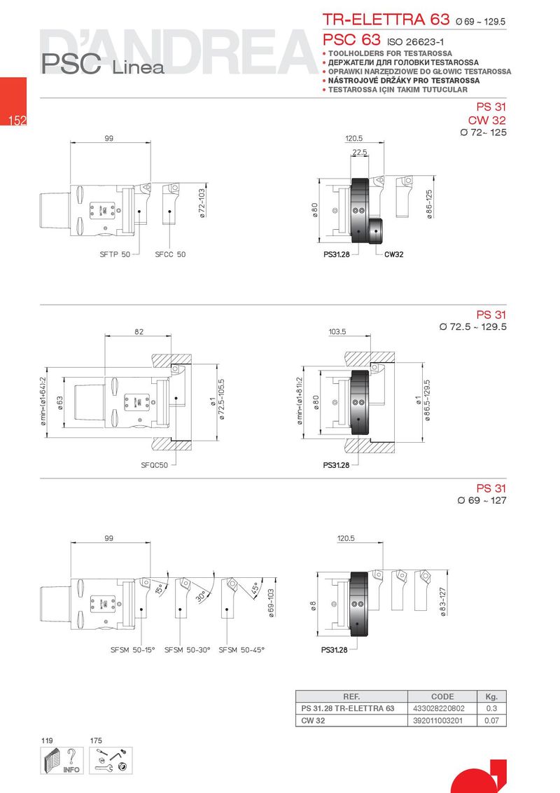 TR-ELETTRA 63 Ø 69 ~ 129.5 PSC 63 ISO 26623-1 PSC • TOOLHOLDERS FOR TESTAROSSA Linea • ДЕРЖАТЕЛИ ДЛЯ ГОЛОВКИ TESTAROSSA • OPRAW.I NARZ}DZIOWE DO GOWIC TESTAROSSA • NÁSTROJOVÉ DR½Á.Y PRO TESTAROSSA • TESTAROSSA IqIN TA.IM TUTUCULAR PS 31 152 CW 32 Ø 72~ 125 PS 31 Ø 72.5 ~ 129.5 PS 31 Ø 69 ~ 127 REF. CODE Kg. PS 31.28 TR-ELETTRA 63 433028220802 0.3 CW 32 392011003201 0.07 119 175