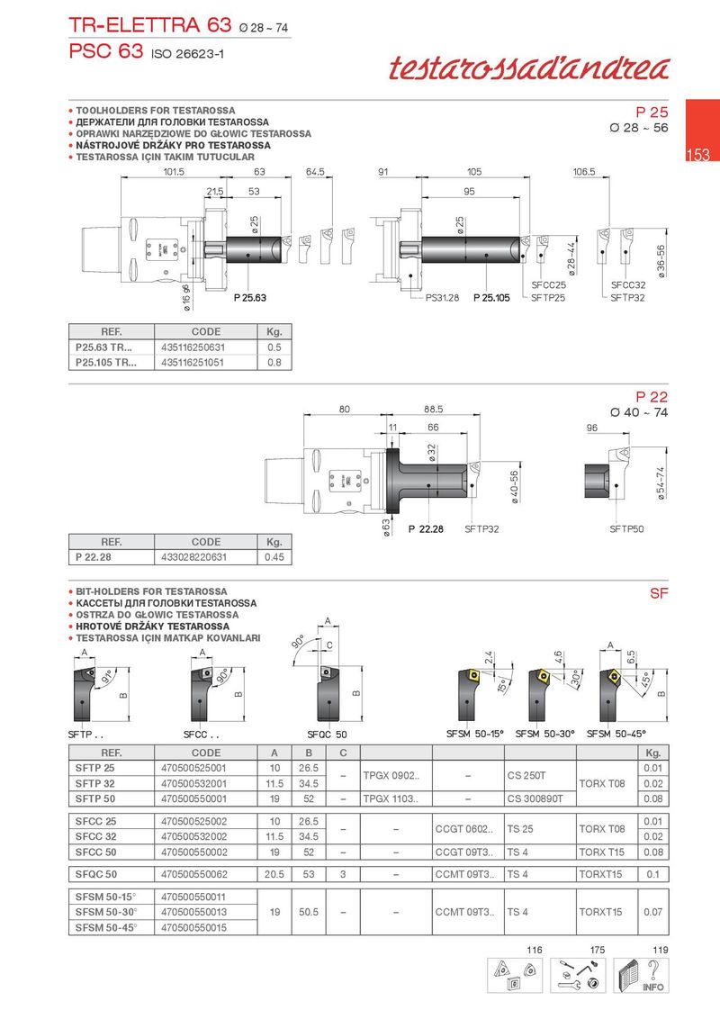 TR-ELETTRA 63 Ø 28 ~ 74 PSC 63 ISO 26623-1 • TOOLHOLDERS FOR TESTAROSSA P 25 • ДЕРЖАТЕЛИ ДЛЯ ГОЛОВКИ TESTAROSSA Ø 28 ~ 56 • OPRAW.I NARZ}DZIOWE DO GOWIC TESTAROSSA • NÁSTROJOVÉ DR½Á.Y PRO TESTAROSSA 153 • TESTAROSSA IqIN TA.IM TUTUCULAR REF. CODE Kg. P25.63 TR... 435116250631 0.5 P25.105 TR... 435116251051 0.8 P 22 Ø 40 ~ 74 REF. CODE Kg. P 22.28 433028220631 0.45 • BIT-HOLDERS FOR TESTAROSSA SF • КАССЕТЫ ДЛЯ ГОЛОВКИ TESTAROSSA • OSTRZA DO GOWIC TESTAROSSA • HROTOVÉ DR½Á.Y TESTAROSSA • TESTAROSSA IqIN MAT.AP .OVANLARI REF. CODE A B C Kg. SFTP 25 470500525001 10 26.5 – TPGX 0902.. – CS 250T 0.01 SFTP 32 470500532001 11.5 34.5 TORX T08 0.02 SFTP 50 470500550001 19 52 – TPGX 1103.. – CS 300890T 0.08 SFCC 25 470500525002 10 26.5 – – CCGT 0602.. TS 25 TORX T08 0.01 SFCC 32 470500532002 11.5 34.5 0.02 SFCC 50 470500550002 19 52 – – CCGT 09T3.. TS 4 TORX T15 0.08 SFQC 50 470500550062 20.5 53 3 – CCMT 09T3.. TS 4 TORXT15 0.1 SFSM 50-15° 470500550011 SFSM 50-30° 470500550013 19 50.5 – – CCMT 09T3.. TS 4 TORXT15 0.07 SFSM 50-45° 470500550015 116 175 119