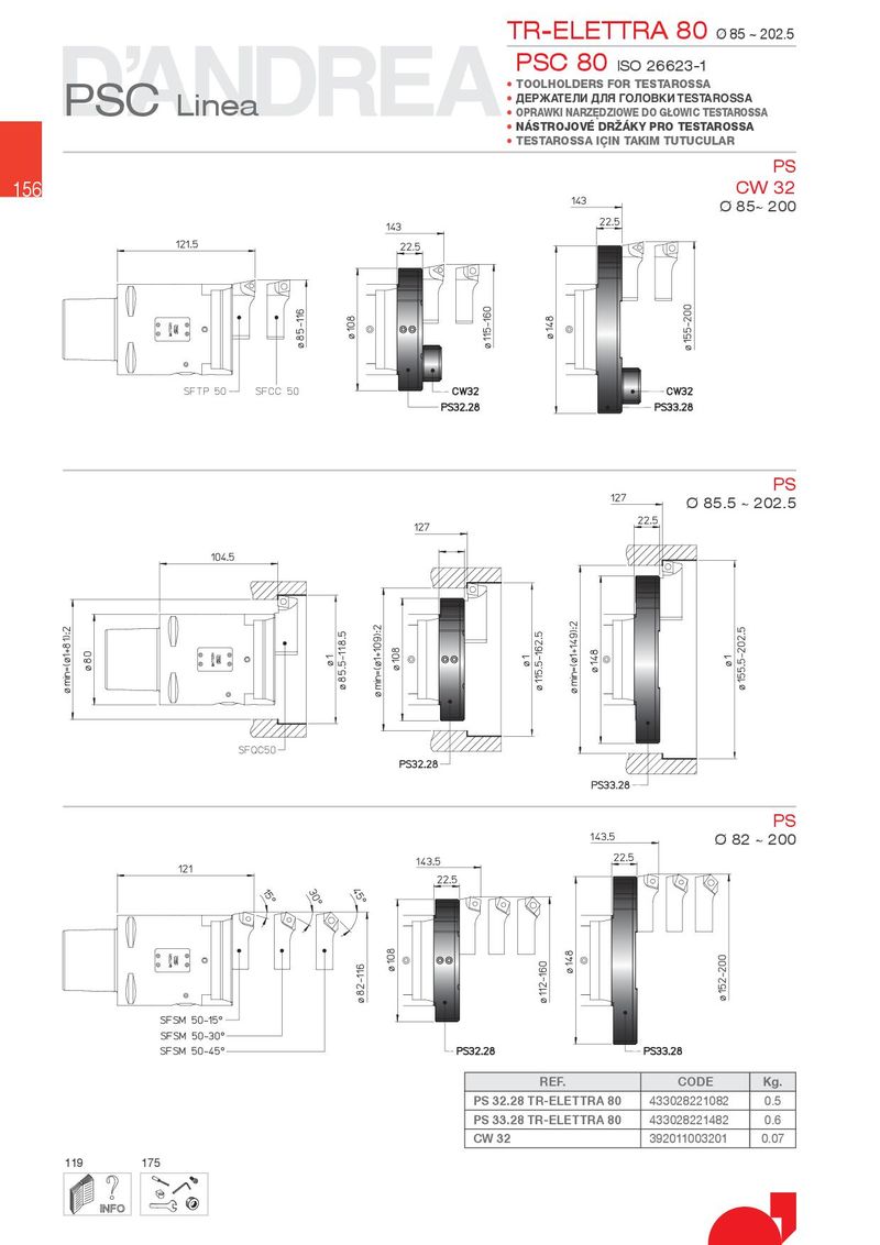 TR-ELETTRA 80 Ø 85 ~ 202.5 PSC 80 ISO 26623-1 PSC • TOOLHOLDERS FOR TESTAROSSA Linea • ДЕРЖАТЕЛИ ДЛЯ ГОЛОВКИ TESTAROSSA • OPRAW.I NARZ}DZIOWE DO GOWIC TESTAROSSA • NÁSTROJOVÉ DR½Á.Y PRO TESTAROSSA • TESTAROSSA IqIN TA.IM TUTUCULAR PS 156 CW 32 Ø 85~ 200 PS Ø 85.5 ~ 202.5 PS Ø 82 ~ 200 REF. CODE Kg. PS 32.28 TR-ELETTRA 80 433028221082 0.5 PS 33.28 TR-ELETTRA 80 433028221482 0.6 CW 32 392011003201 0.07 119 175