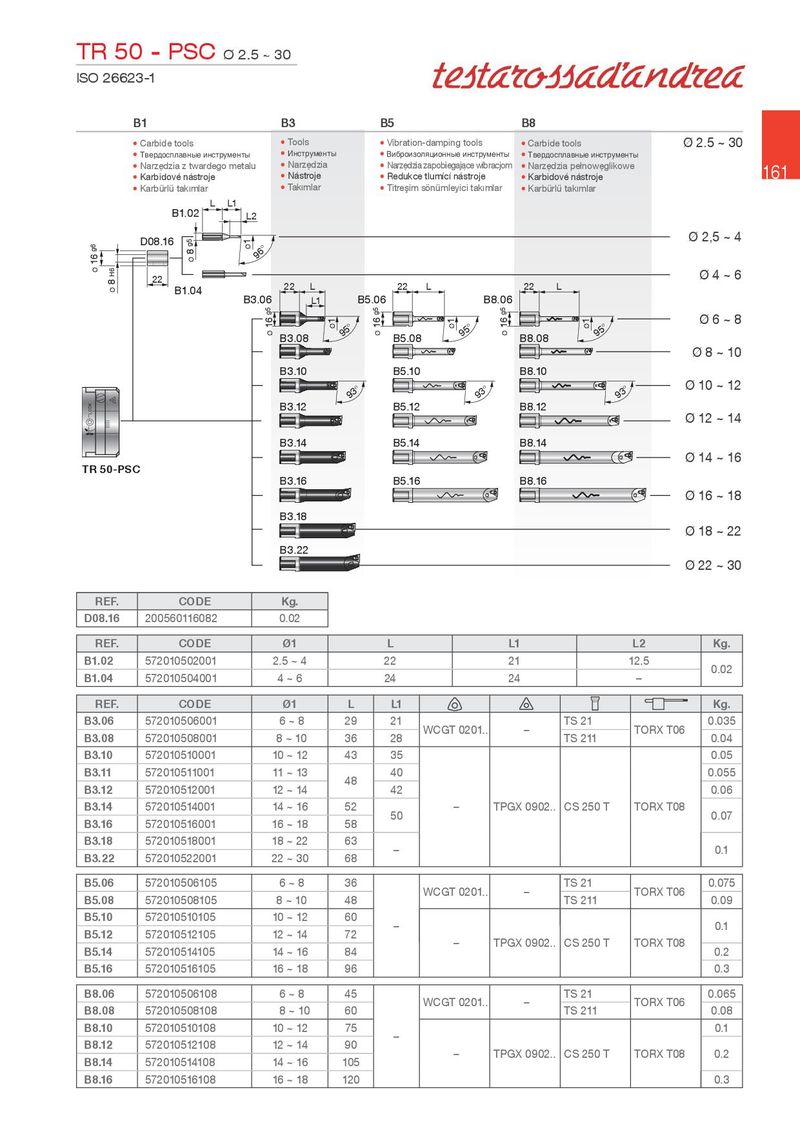 TR 50 - PSC Ø 2.5 ~ 30 ISO 26623-1 B1 B3 B5 B8 •&DUELGHWRROV • Tools •9LEUDWLRQGDPSLQJWRROV •&DUELGHWRROV Ø 2.5 ~ 30 • Твердосплавные инструменты • Инструменты • Виброизоляционные инструменты • Твердосплавные инструменты •1DU]ĸG]LD]WZDUGHJRPHWDOX •1DU]ĸG]LD • 1DU]ĸG]LD]DSRELHJDMĝFHZLEUDFMRP •1DU]ĸG]LDSHŕQRZĸJOLNRZH 161 •.DUELGRYÆQ¾VWURMH •1¾VWURMH •5HGXNFHWOXPÊFÊQ¾VWURMH •.DUELGRYÆQ¾VWURMH •.DUEÙUOÙWDNIJPODU •7DNIJPODU •7LWUHūLPVÓQÙPOH\LFLWDNIJPODU •.DUEÙUOÙWDNIJPODU / / B1.02 / 16 J D08.16 Ø 8 J Ø1 Ø 2,5 ~ 4 96° Ø H6 Ø4~6 8 22 22 / 22 / 22 / Ø B1.04 B3.06 / B5.06 B8.06 J J J Ø6~8 16 Ø1 95° 16 Ø1 95° 16 Ø1 95° Ø B3.08 Ø B5.08 Ø B8.08 Ø 8 ~ 10 B3.10 B5.10 B8.10 93° 93° 93° Ø 10 ~ 12 B3.12 B5.12 B8.12 Ø 12 ~ 14 B3.14 B5.14 B8.14 Ø 14 ~ 16 TR 50-PSC B3.16 B5.16 B8.16 Ø 16 ~ 18 B3.18 Ø 18 ~ 22 B3.22 Ø 22 ~ 30 REF. CODE Kg. D08.16 200560116082 0.02 REF. CODE Ø1 L L1 L2 Kg. B1.02 572010502001 2.5 ~ 4 22 21 12.5 0.02 B1.04 572010504001 4~6 24 24 – REF. CODE Ø1 L L1 Kg. B3.06 572010506001 6~8 29 21 WCGT 0201.. – TS 21 TORX T06 0.035 B3.08 572010508001 8 ~ 10 36 28 TS 211 0.04 B3.10 572010510001 10 ~ 12 43 35 0.05 B3.11 572010511001 11 ~ 13 48 40 0.055 B3.12 572010512001 12 ~ 14 42 0.06 B3.14 572010514001 14 ~ 16 52 50 – TPGX 0902.. CS 250 T TORX T08 0.07 B3.16 572010516001 16 ~ 18 58 B3.18 572010518001 18 ~ 22 63 – 0.1 B3.22 572010522001 22 ~ 30 68 B5.06 572010506105 6~8 36 WCGT 0201.. – TS 21 TORX T06 0.075 B5.08 572010508105 8 ~ 10 48 TS 211 0.09 B5.10 572010510105 10 ~ 12 60 – 0.1 B5.12 572010512105 12 ~ 14 72 – TPGX 0902.. CS 250 T TORX T08 B5.14 572010514105 14 ~ 16 84 0.2 B5.16 572010516105 16 ~ 18 96 0.3 B8.06 572010506108 6~8 45 WCGT 0201.. – TS 21 TORX T06 0.065 B8.08 572010508108 8 ~ 10 60 TS 211 0.08 B8.10 572010510108 10 ~ 12 75 – 0.1 B8.12 572010512108 12 ~ 14 90 – TPGX 0902.. CS 250 T TORX T08 0.2 B8.14 572010514108 14 ~ 16 105 B8.16 572010516108 16 ~ 18 120 0.3