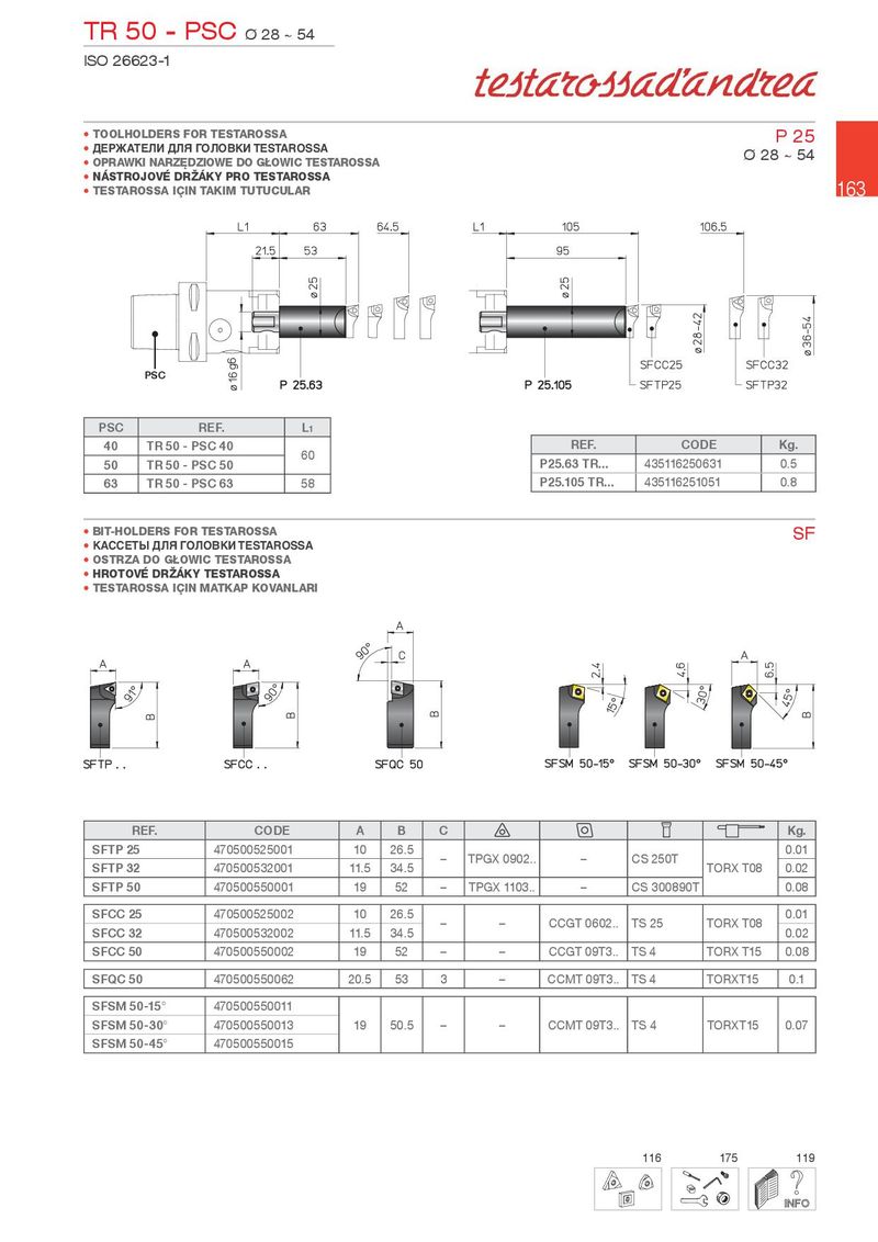 TR 50 - PSC Ø 28 ~ 54 ISO 26623-1 • TOOLHOLDERS FOR TESTAROSSA P 25 • ДЕРЖАТЕЛИ ДЛЯ ГОЛОВКИ TESTAROSSA Ø 28 ~ 54 • OPRAW.I NARZ}DZIOWE DO GOWIC TESTAROSSA • NÁSTROJOVÉ DR½Á.Y PRO TESTAROSSA 163 • TESTAROSSA IqIN TA.IM TUTUCULAR PSC PSC REF. L1 40 TR 50 - PSC 40 60 REF. CODE Kg. 50 TR 50 - PSC 50 P25.63 TR... 435116250631 0.5 63 TR 50 - PSC 63 58 P25.105 TR... 435116251051 0.8 • BIT-HOLDERS FOR TESTAROSSA SF • КАССЕТЫ ДЛЯ ГОЛОВКИ TESTAROSSA • OSTRZA DO GOWIC TESTAROSSA • HROTOVÉ DR½Á.Y TESTAROSSA • TESTAROSSA IqIN MAT.AP .OVANLARI REF. CODE A B C Kg. SFTP 25 470500525001 10 26.5 – TPGX 0902.. – CS 250T 0.01 SFTP 32 470500532001 11.5 34.5 TORX T08 0.02 SFTP 50 470500550001 19 52 – TPGX 1103.. – CS 300890T 0.08 SFCC 25 470500525002 10 26.5 – – CCGT 0602.. TS 25 TORX T08 0.01 SFCC 32 470500532002 11.5 34.5 0.02 SFCC 50 470500550002 19 52 – – CCGT 09T3.. TS 4 TORX T15 0.08 SFQC 50 470500550062 20.5 53 3 – CCMT 09T3.. TS 4 TORXT15 0.1 SFSM 50-15° 470500550011 SFSM 50-30° 470500550013 19 50.5 – – CCMT 09T3.. TS 4 TORXT15 0.07 SFSM 50-45° 470500550015 116 175 119