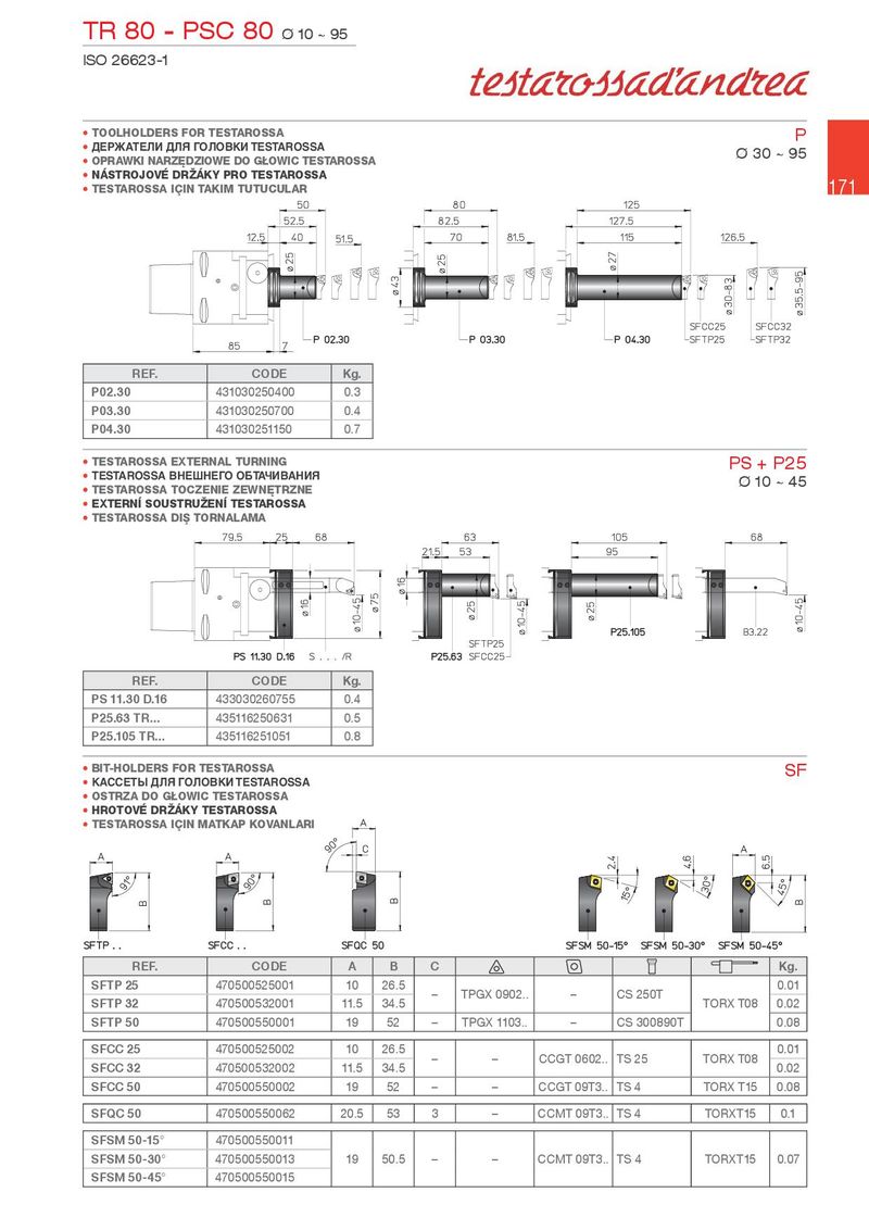 TR 80 - PSC 80 Ø 10 ~ 95 ISO 26623-1 • TOOLHOLDERS FOR TESTAROSSA P • ДЕРЖАТЕЛИ ДЛЯ ГОЛОВКИ TESTAROSSA Ø 30 ~ 95 • OPRAW.I NARZ}DZIOWE DO GOWIC TESTAROSSA • NÁSTROJOVÉ DR½Á.Y PRO TESTAROSSA 171 • TESTAROSSA IqIN TA.IM TUTUCULAR REF. CODE Kg. P02.30 431030250400 0.3 P03.30 431030250700 0.4 P04.30 431030251150 0.7 • TESTAROSSA EXTERNAL TURNING PS + P25 • TESTAROSSA ВНЕШНЕГО ОБТАЧИВАНИЯ Ø 10 ~ 45 • TESTAROSSA TOCZENIE ZEWN}TRZNE • EXTERN SOUSTRU½EN TESTAROSSA • TESTAROSSA DI§ TORNALAMA REF. CODE Kg. PS 11.30 D.16 433030260755 0.4 P25.63 TR... 435116250631 0.5 P25.105 TR... 435116251051 0.8 • BIT-HOLDERS FOR TESTAROSSA SF • КАССЕТЫ ДЛЯ ГОЛОВКИ TESTAROSSA • OSTRZA DO GOWIC TESTAROSSA • HROTOVÉ DR½Á.Y TESTAROSSA • TESTAROSSA IqIN MAT.AP .OVANLARI REF. CODE A B C Kg. SFTP 25 470500525001 10 26.5 – TPGX 0902.. – CS 250T 0.01 SFTP 32 470500532001 11.5 34.5 TORX T08 0.02 SFTP 50 470500550001 19 52 – TPGX 1103.. – CS 300890T 0.08 SFCC 25 470500525002 10 26.5 – – CCGT 0602.. TS 25 TORX T08 0.01 SFCC 32 470500532002 11.5 34.5 0.02 SFCC 50 470500550002 19 52 – – CCGT 09T3.. TS 4 TORX T15 0.08 SFQC 50 470500550062 20.5 53 3 – CCMT 09T3.. TS 4 TORXT15 0.1 SFSM 50-15° 470500550011 SFSM 50-30° 470500550013 19 50.5 – – CCMT 09T3.. TS 4 TORXT15 0.07 SFSM 50-45° 470500550015