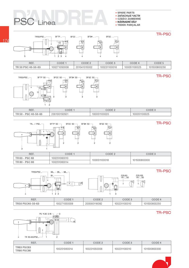 • SPARE PARTS • ЗАПАСНЫЕ ЧАСТИ PSC Linea • CZ}¤CI ZAMIENNE • NÁHRADN D LY • YEDE. PARqALAR TR-PSC 174 REF. CODE 1 CODE 2 CODE 3 CODE 4 CODE 5 TR 50 PSC 40-50-63 100271050008 201041015002 100231100016 100051100025 101500800250 TR-PSC REF. CODE 1 CODE 2 CODE 3 TR 50 - PSC 40-50-63 200100150501 100051100020 100051100025 TR-PSC REF. CODE 1 CODE 2 CODE 3 TR 63 - PSC 63 100251060010 100051100018 101500800300 TR 80 - PSC 80 100251060014 TR-PSC REF. CODE 1 CODE 2 CODE 3 CODE 4 TR50 PSC40-50-63 100271050008 200560116082 100231100010 101500800250 TR-PSC REF. CODE 1 CODE 2 CODE 3 CODE 4 TR63 PSC63 100251060014 100231050006 100231100010 101500800300 TR80 PSC80