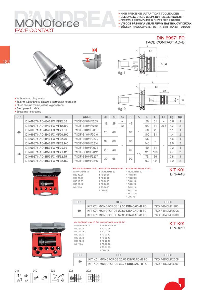 • HIGH PRECISION ULTRA-TIGHT TOOLHOLDER • ВЫСОКОЖЕСТКИЕ СВЕРХТОЧНЫЕ ДЕРЖАТЕЛИ MONOforce • OPRAWKA PRECYZYJNA O DU¾EJ SILE ZACISKU • VYSOCE P¢ESN¹ A VELMI PEVN¹ NÁSTROJOV¹ DR½ÁK • YÜKSEK HASSASIYETLI ULTRA SIKI TAKIM TUTUCU FACE CONTACT DIN 69871 FC FACE CONTACT AD+B 182 fig.1 • Without clamping wrench • Зажимный ключ не входит в комплект поставки •.OXF]]DFLVNRZ\QLHMHVWQDZ\SRVDƅHQLX • %H]XSÊQDFÊKRNOÊĦH fig.2 •6IJNIJūWIJUPDDQDKWDUVIJ] DIN REF. CODE d1 d2 d3 H A L L1 L2 kg fig. DIN69871-AD+B40 FC MF12.50 71DIF-B40MF1205 12 28 – 46 50 31 – 0.8 1 DIN69871-AD+B40 FC MF12.100 71DIF-B40MF1210 32 100 81 29.5 1.2 2 40 DIN69871-AD+B40 FC MF20.60 71DIF-B40MF2006 20 48 63 1 60 41 1.1 1 DIN69871-AD+B40 FC MF20.100 71DIF-B40MF2010 100 81 1.4 2 DIN69871-AD+B40 FC MF32.95 71DIF-B40MF3209 32 66 80 95 – 1.6 1 DIN69871-AD+B40 FC MF32.140 71DIF-B40MF3214 – 140 – 2.0 2 DIN69871-AD+B50 FC MF20.80 71DIF-B50MF2008 20 48 63 80 61 2.3 1 50 DIN69871-AD+B50 FC MF20.125 71DIF-B50MF2012 1.5 125 106 2.7 2 DIN69871-AD+B50 FC MF32.75 71DIF-B50MF3207 32 66 90 75 56 2.8 1 DIN69871-AD+B50 FC MF32.160 71DIF-B50MF3216 160 141 3.2 2 K01 MONOforce 12 FC K01 MONOforce 20 FC K01 MONOforce 32 FC KIT K01 1 MONOforce 12 1 MONOforce 20 1 MONOforce 32 1 RC 12.04 1 RC 20.06 1 RC 32.06 DIN-A40 1 RC 12.06 1 RC 20.08 1 RC 32.08 1 RC 12.08 1 RC 20.10 1 RC 32.10 1 RC 12.10 1 RC 20.12 1 RC 32.12 1 CHV 28 1 RC 20.16 1 RC 32.16 1 CHV 50 1 RC 32.20 1 RC 32.25 1 CHV 75 DIN REF. CODE KIT K01 MONOFORCE 12.50 DIN40AD+B FC 7KDIF-B40MF1205 40 KIT K01 MONOFORCE 20.60 DIN40AD+B FC 7KDIF-B40MF2006 KIT K01 MONOFORCE 32.95 DIN40AD+B FC 7KDIF-B40MF3209 K01 MONOforce 20 FC K01 MONOforce 32 FC KIT K01 1 MONOforce 20 1 MONOforce 32 1 RC 20.06 1 RC 32.06 DIN-A50 1 RC 20.08 1 RC 32.08 1 RC 20.10 1 RC 32.10 1 RC 20.12 1 RC 32.12 1 RC 20.16 1 RC 32.16 1 CHV 50 1 RC 32.20 1 RC 32.25 1 CHV 75 DIN REF. CODE 50 KIT K01 MONOFORCE 20.80 DIN50AD+B FC 7KDIF-B50MF2008 KIT K01 MONOFORCE 32.75 DIN50AD+B FC 7KDIF-B50MF3207 241 240 222 222 222
