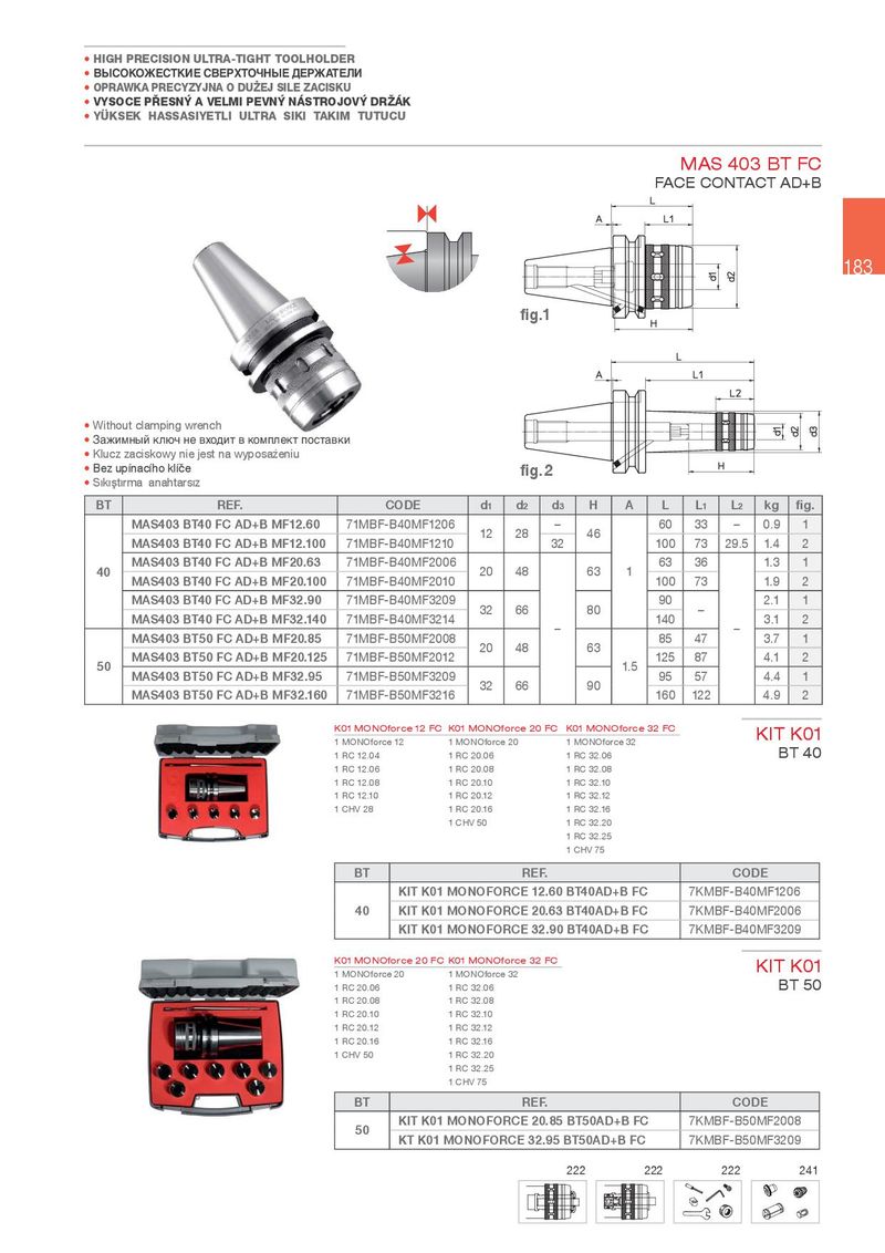 • HIGH PRECISION ULTRA-TIGHT TOOLHOLDER • ВЫСОКОЖЕСТКИЕ СВЕРХТОЧНЫЕ ДЕРЖАТЕЛИ • OPRAWKA PRECYZYJNA O DU¾EJ SILE ZACISKU • VYSOCE P¢ESN¹ A VELMI PEVN¹ NÁSTROJOV¹ DR½ÁK • YÜKSEK HASSASIYETLI ULTRA SIKI TAKIM TUTUCU MAS 403 BT FC FACE CONTACT AD+B 183 fig.1 • Without clamping wrench • Зажимный ключ не входит в комплект поставки •.OXF]]DFLVNRZ\QLHMHVWQDZ\SRVDƅHQLX • %H]XSÊQDFÊKRNOÊĦH fig.2 •6IJNIJūWIJUPDDQDKWDUVIJ] BT REF. CODE d1 d2 d3 H A L L1 L2 kg fig. MAS403 BT40 FC AD+B MF12.60 71MBF-B40MF1206 12 28 – 46 60 33 – 0.9 1 MAS403 BT40 FC AD+B MF12.100 71MBF-B40MF1210 32 100 73 29.5 1.4 2 40 MAS403 BT40 FC AD+B MF20.63 71MBF-B40MF2006 20 48 63 1 63 36 1.3 1 MAS403 BT40 FC AD+B MF20.100 71MBF-B40MF2010 100 73 1.9 2 MAS403 BT40 FC AD+B MF32.90 71MBF-B40MF3209 32 66 80 90 – 2.1 1 MAS403 BT40 FC AD+B MF32.140 71MBF-B40MF3214 – 140 – 3.1 2 MAS403 BT50 FC AD+B MF20.85 71MBF-B50MF2008 20 48 63 85 47 3.7 1 50 MAS403 BT50 FC AD+B MF20.125 71MBF-B50MF2012 1.5 125 87 4.1 2 MAS403 BT50 FC AD+B MF32.95 71MBF-B50MF3209 32 66 90 95 57 4.4 1 MAS403 BT50 FC AD+B MF32.160 71MBF-B50MF3216 160 122 4.9 2 K01 MONOforce 12 FC K01 MONOforce 20 FC K01 MONOforce 32 FC KIT K01 1 MONOforce 12 1 MONOforce 20 1 MONOforce 32 1 RC 12.04 1 RC 20.06 1 RC 32.06 BT 40 1 RC 12.06 1 RC 20.08 1 RC 32.08 1 RC 12.08 1 RC 20.10 1 RC 32.10 1 RC 12.10 1 RC 20.12 1 RC 32.12 1 CHV 28 1 RC 20.16 1 RC 32.16 1 CHV 50 1 RC 32.20 1 RC 32.25 1 CHV 75 BT REF. CODE KIT K01 MONOFORCE 12.60 BT40AD+B FC 7KMBF-B40MF1206 40 KIT K01 MONOFORCE 20.63 BT40AD+B FC 7KMBF-B40MF2006 KIT K01 MONOFORCE 32.90 BT40AD+B FC 7KMBF-B40MF3209 K01 MONOforce 20 FC K01 MONOforce 32 FC KIT K01 1 MONOforce 20 1 MONOforce 32 1 RC 20.06 1 RC 32.06 BT 50 1 RC 20.08 1 RC 32.08 1 RC 20.10 1 RC 32.10 1 RC 20.12 1 RC 32.12 1 RC 20.16 1 RC 32.16 1 CHV 50 1 RC 32.20 1 RC 32.25 1 CHV 75 BT REF. CODE 50 KIT K01 MONOFORCE 20.85 BT50AD+B FC 7KMBF-B50MF2008 KT K01 MONOFORCE 32.95 BT50AD+B FC 7KMBF-B50MF3209 222 222 222 241