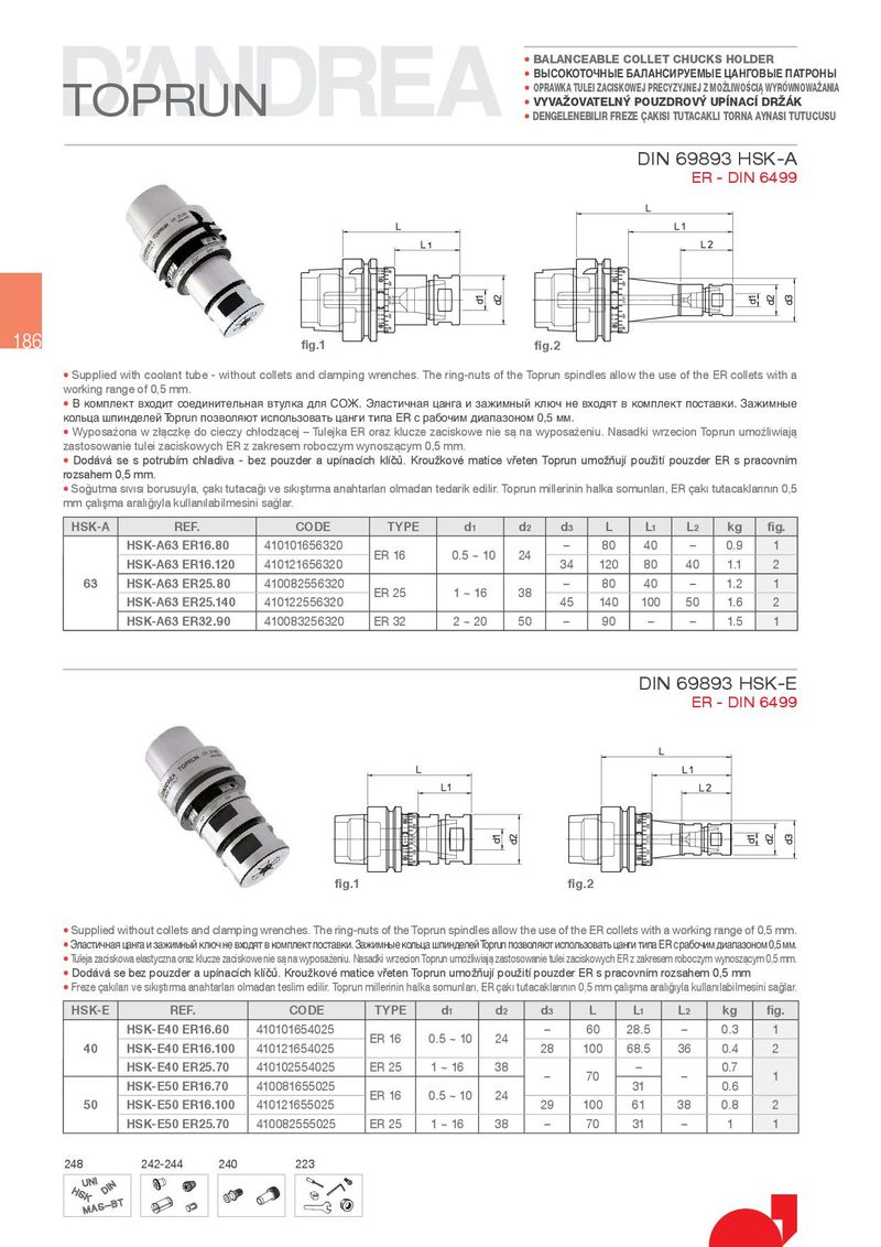 • BALANCEABLE COLLET CHUCKS HOLDER • ВЫСОКОТОЧНЫЕ БАЛАНСИРУЕМЫЕ ЦАНГОВЫЕ ПАТРОНЫ TOPRUN • OPRAWKA TULEI ZACISKOWEJ PRECYZYJNEJ Z MO¾LIWO¤CIk WYRÓWNOWA¾ANIA • VYVA½OVATELN¹ POUZDROV¹ UP NAC DR½ÁK • DENGELENEBILIR FREZE qAKISI TUTACAKLI TORNA AYNASI TUTUCUSU DIN 69893 HSK-A ER - DIN 6499 186 fig.1 fig.2 •6XSSOLHGZLWKFRRODQWWXEHZLWKRXWFROOHWVDQGFODPSLQJZUHQFKHV7KHULQJQXWVRIWKH7RSUXQVSLQGOHVDOORZWKHXVHRIWKH(5FROOHWVZLWKD ZRUNLQJUDQJHRIPP • В комплект входит соединительная втулка для СОЖ. Эластичная цанга и зажимный ключ не входят в комплект поставки. Зажимные кольца шпинделей Toprun позволяют использовать цанги типа ER с рабочим диапазоном 0,5 мм. •:\SRVDƅRQDZ]ŕĝF]NĸGRFLHF]\FKŕRG]ĝFHMt7XOHMND(5RUD]NOXF]H]DFLVNRZHQLHVĝQDZ\SRVDƅHQLX1DVDGNLZU]HFLRQ7RSUXQXPRƅOLZLDMĝ ]DVWRVRZDQLHWXOHL]DFLVNRZ\FK(5]]DNUHVHPURERF]\PZ\QRV]ĝF\PPP • 'RG¾Y¾ VH V SRWUXEÊP FKODGLYD EH] SRX]GHU D XSÊQDFÊFK NOÊĦƀ .URX{NRYÆ PDWLFH YŦHWHQ 7RSUXQ XPR{ŚXMÊ SRX{LWÊ SRX]GHU (5 V SUDFRYQÊP UR]VDKHPPP •6RĽXWPDVIJYIJVIJERUXVX\ODÄDNIJWXWDFDĽIJYHVIJNIJūWIJUPDDQDKWDUODUIJROPDGDQWHGDULNHGLOLU7RSUXQPLOOHULQLQKDONDVRPXQODUIJ(5ÄDNIJWXWDFDNODUIJQIJQ PPÄDOIJūPDDUDOIJĽIJ\ODNXOODQIJODELOPHVLQLVDĽODU HSK-A REF. CODE TYPE d1 d2 d3 L L1 L2 kg fig. HSK-A63 ER16.80 ER 16 a 24 – 80 40 – 0.9 1 HSK-A63 ER16.120 34 120 80 40 1.1 2 63 HSK-A63 ER25.80 (5 a 38 – 80 40 – 1.2 1 HSK-A63 ER25.140 140 100 1.6 2 HSK-A63 ER32.90 ER 32 a – 90 – – 1 DIN 69893 HSK-E ER - DIN 6499 fig.1 fig.2 •6XSSOLHGZLWKRXWFROOHWVDQGFODPSLQJZUHQFKHV7KHULQJQXWVRIWKH7RSUXQVSLQGOHVDOORZWKHXVHRIWKH(5FROOHWVZLWKDZRUNLQJUDQJHRIPP • Эластичная цанга и зажимный ключ не входят в комплект поставки. Зажимные кольца шпинделей Toprun позволяют использовать цанги типа ER с рабочим диапазоном 0,5 мм. • 7XOHMD]DFLVNRZDHODVW\F]QDRUD]NOXF]H]DFLVNRZHQLHVĝQDZ\SRVDƅHQLX1DVDGNLZU]HFLRQ7RSUXQXPRƅOLZLDMĝ]DVWRVRZDQLHWXOHL]DFLVNRZ\FK(5]]DNUHVHPURERF]\PZ\QRV]ĝF\PPP •'RG¾Y¾VHEH]SRX]GHUDXSÊQDFÊFKNOÊĦƀ.URX{NRYÆPDWLFHYŦHWHQ7RSUXQXPR{ŚXMÊSRX{LWÊSRX]GHU(5VSUDFRYQÊPUR]VDKHPPP • )UH]HÄDNIJODUIJYHVIJNIJūWIJUPDDQDKWDUODUIJROPDGDQWHVOLPHGLOLU7RSUXQPLOOHULQLQKDONDVRPXQODUIJ(5ÄDNIJWXWDFDNODUIJQIJQPPÄDOIJūPDDUDOIJĽIJ\ODNXOODQIJODELOPHVLQLVDĽODU HSK-E REF. CODE TYPE d1 d2 d3 L L1 L2 kg fig. HSK-E40 ER16.60 ER 16 a 24 – 60 – 0.3 1 40 HSK-E40 ER16.100 28 100 36 0.4 2 HSK-E40 ER25.70 (5 a 38 – 70 – – 0.7 1 HSK-E50 ER16.70 ER 16 a 24 31 0.6 50 HSK-E50 ER16.100 29 100 61 38 0.8 2 HSK-E50 ER25.70 (5 a 38 – 70 31 – 1 1 248 242-244 240 223