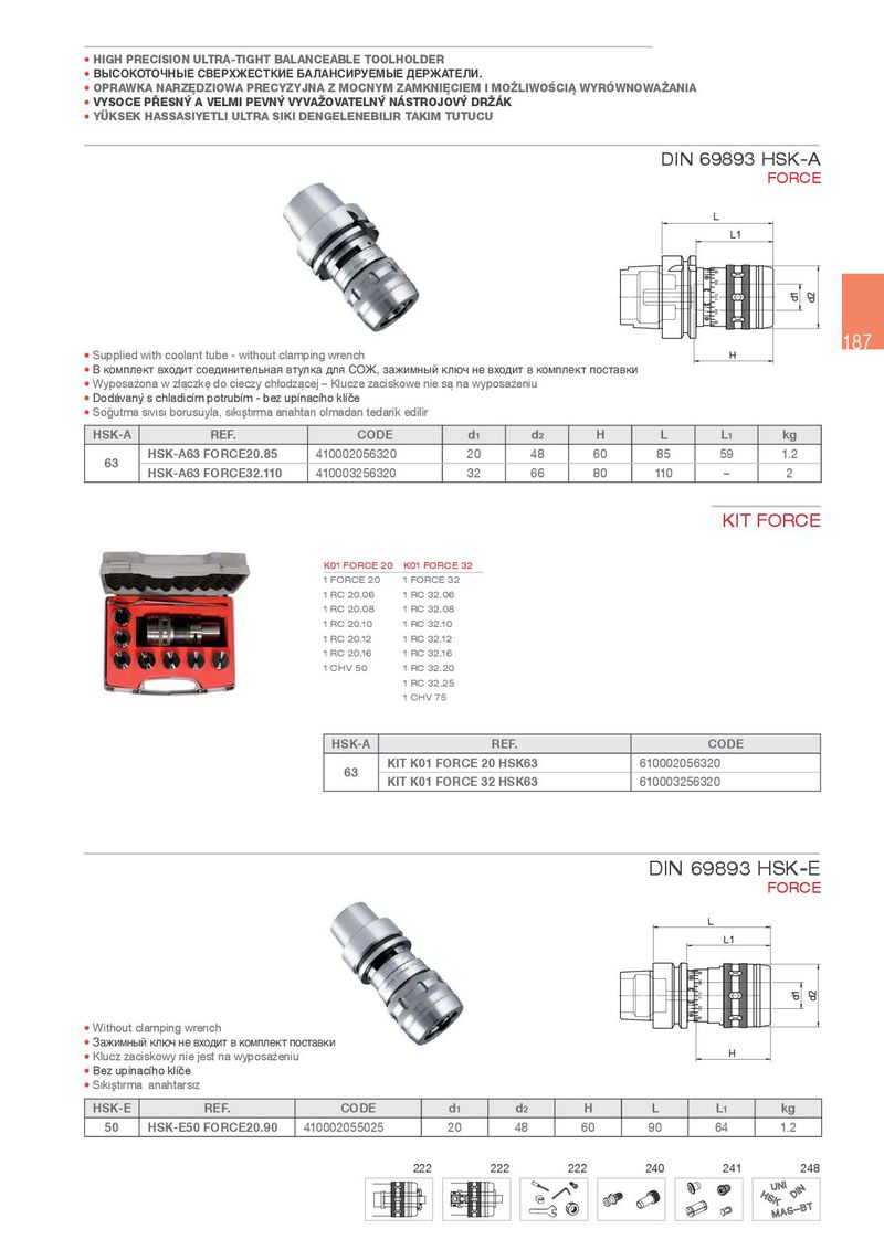 • HIGH PRECISION ULTRA-TIGHT BALANCEABLE TOOLHOLDER • ВЫСОКОТОЧНЫЕ СВЕРХЖЕСТКИЕ БАЛАНСИРУЕМЫЕ ДЕРЖАТЕЛИ. • OPRAWKA NARZ}DZIOWA PRECYZYJNA Z MOCNYM ZAMKNI}CIEM I MO¾LIWO¤CIk WYRÓWNOWA¾ANIA • VYSOCE P¢ESN¹ A VELMI PEVN¹ VYVA½OVATELN¹ NÁSTROJOV¹ DR½ÁK • YÜKSEK HASSASIYETLI ULTRA SIKI DENGELENEBILIR TAKIM TUTUCU DIN 69893 HSK-A FORCE •6XSSOLHGZLWKFRRODQWWXEHZLWKRXWFODPSLQJZUHQFK 187 • В комплект входит соединительная втулка для СОЖ, зажимный ключ не входит в комплект поставки •:\SRVDƅRQDZ]ŕĝF]NĸGRFLHF]\FKŕRG]ĝFHMt.OXF]H]DFLVNRZHQLHVĝQDZ\SRVDƅHQLX • 'RG¾YDQÚVFKODGLFÊPSRWUXEÊPEH]XSÊQDFÊKRNOÊĦH •6RĽXWPDVIJYIJVIJERUXVX\ODVIJNIJūWIJUPDDQDKWDUIJROPDGDQWHGDULNHGLOLU HSK-A REF. CODE d1 d2 H L L1 kg 63 HSK-A63 FORCE20.85 20 48 60 1.2 HSK-A63 FORCE32.110 32 66 80 110 – 2 KIT FORCE K01 FORCE 20 K01 FORCE 32 1 FORCE 20 1 FORCE 32 1 RC 20.06 1 RC 32.06 1 RC 20.08 1 RC 32.08 1 RC 20.10 1 RC 32.10 1 RC 20.12 1 RC 32.12 1 RC 20.16 1 RC 32.16 1 CHV 50 1 RC 32.20 1 RC 32.25 1 CHV 75 HSK-A REF. CODE 63 KIT K01 FORCE 20 HSK63 KIT K01 FORCE 32 HSK63 DIN 69893 HSK-E FORCE •:LWKRXWFODPSLQJZUHQFK • Зажимный ключ не входит в комплект поставки •.OXF]]DFLVNRZ\QLHMHVWQDZ\SRVDƅHQLX • %H]XSÊQDFÊKRNOÊĦH •6IJNIJūWIJUPDDQDKWDUVIJ] HSK-E REF. CODE d1 d2 H L L1 kg 50 HSK-E50 FORCE20.90 20 48 60 90 64 1.2 222 222 222 240 241 248