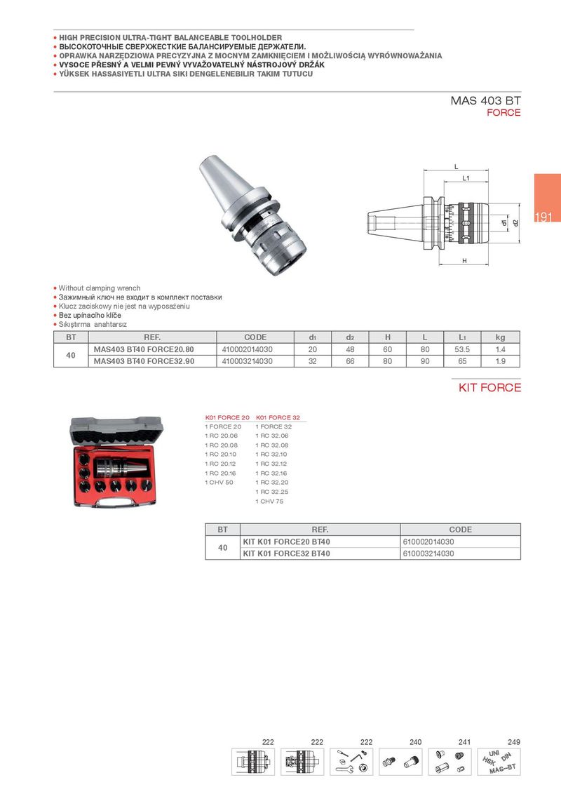 • HIGH PRECISION ULTRA-TIGHT BALANCEABLE TOOLHOLDER • ВЫСОКОТОЧНЫЕ СВЕРХЖЕСТКИЕ БАЛАНСИРУЕМЫЕ ДЕРЖАТЕЛИ. • OPRAWKA NARZ}DZIOWA PRECYZYJNA Z MOCNYM ZAMKNI}CIEM I MO¾LIWO¤CIk WYRÓWNOWA¾ANIA • VYSOCE P¢ESN¹ A VELMI PEVN¹ VYVA½OVATELN¹ NÁSTROJOV¹ DR½ÁK • YÜKSEK HASSASIYETLI ULTRA SIKI DENGELENEBILIR TAKIM TUTUCU MAS 403 BT FORCE 191 •:LWKRXWFODPSLQJZUHQFK • Зажимный ключ не входит в комплект поставки •.OXF]]DFLVNRZ\QLHMHVWQDZ\SRVDƅHQLX • %H]XSÊQDFÊKRNOÊĦH •6IJNIJūWIJUPDDQDKWDUVIJ] BT REF. CODE d1 d2 H L L1 kg 40 MAS403 BT40 FORCE20.80 410002014030 20 48 60 80 1.4 MAS403 BT40 FORCE32.90 410003214030 32 66 80 90 1.9 KIT FORCE K01 FORCE 20 K01 FORCE 32 1 FORCE 20 1 FORCE 32 1 RC 20.06 1 RC 32.06 1 RC 20.08 1 RC 32.08 1 RC 20.10 1 RC 32.10 1 RC 20.12 1 RC 32.12 1 RC 20.16 1 RC 32.16 1 CHV 50 1 RC 32.20 1 RC 32.25 1 CHV 75 BT REF. CODE 40 KIT K01 FORCE20 BT40 610002014030 KIT K01 FORCE32 BT40 610003214030 222 222 222 240 241 249