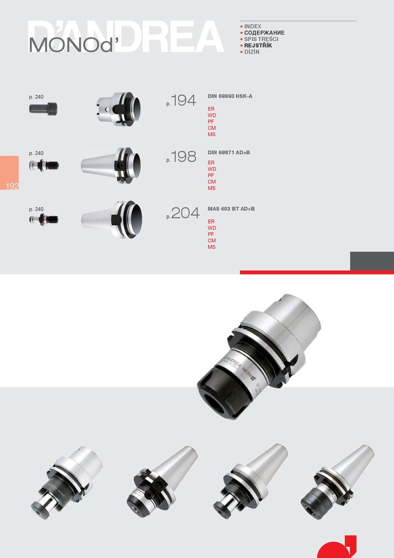 • INDEX • СОДЕРЖАНИЕ MONOd’ • SPIS TREùCI • REJST¢ K • Dá9áN p. 240 p.194 DIN 69893 HSK-A ER WD PF CM MS p. 240 p.198 DIN 69871 AD+B ER WD PF 192 CM MS p. 240 p.204 MAS 403 BT AD+B ER WD PF CM MS
