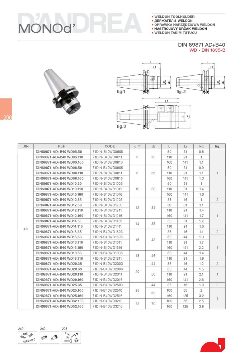 • WELDON TOOLHOLDER • ДЕРЖАТЕЛИ WELDON MONOd’ • OPRAWKA NARZ}DZIOWA WELDON • NÁSTROJOV¹ DR½ÁK WELDON • WELDON TAKIM TUTUCU DIN 69871 AD+B40 WD - DIN 1835-B fig.1 fig.2 200 fig.3 DIN REF. CODE d1H5 d2 L L1 kg fig. DIN69871-AD+B40 WD06.50 71DIN-B40WD0605 50 31 0.8 DIN69871-AD+B40 WD06.110 71DIN-B40WD0611 6 23 110 91 1 DIN69871-AD+B40 WD06.160 71DIN-B40WD0616 160 141 1.1 DIN69871-AD+B40 WD08.50 71DIN-B40WD0805 50 31 0.9 DIN69871-AD+B40 WD08.110 71DIN-B40WD0811 8 26 110 91 1.1 1 DIN69871-AD+B40 WD08.160 71DIN-B40WD0816 160 141 1.3 DIN69871-AD+B40 WD10.50 71DIN-B40WD1005 50 31 1 DIN69871-AD+B40 WD10.110 71DIN-B40WD1011 10 30 110 91 1.4 DIN69871-AD+B40 WD10.160 71DIN-B40WD1016 160 141 1.6 DIN69871-AD+B40 WD12.35 71DIN-B40WD1203 35 16 1 2 DIN69871-AD+B40 WD12.50 71DIN-B40WD1205 12 34 50 31 1.1 DIN69871-AD+B40 WD12.110 71DIN-B40WD1211 110 91 1.4 DIN69871-AD+B40 WD12.160 71DIN-B40WD1216 160 141 1.7 1 DIN69871-AD+B40 WD14.50 71DIN-B40WD1405 14 38 50 31 1.2 40 DIN69871-AD+B40 WD14.110 71DIN-B40WD1411 110 91 1.6 DIN69871-AD+B40 WD16.35 71DIN-B40WD1603 35 16 1.1 2 DIN69871-AD+B40 WD16.63 71DIN-B40WD1606 16 42 63 44 1.3 DIN69871-AD+B40 WD16.110 71DIN-B40WD1611 110 91 1.7 DIN69871-AD+B40 WD16.160 71DIN-B40WD1616 160 141 2.2 1 DIN69871-AD+B40 WD18.63 71DIN-B40WD1806 18 46 63 44 1.4 DIN69871-AD+B40 WD18.110 71DIN-B40WD1811 110 91 1.9 DIN69871-AD+B40 WD20.35 71DIN-B40WD2003 44 35 16 1.2 2 DIN69871-AD+B40 WD20.63 71DIN-B40WD2006 20 63 44 1.5 DIN69871-AD+B40 WD20.110 71DIN-B40WD2011 50 110 91 2.1 1 DIN69871-AD+B40 WD20.160 71DIN-B40WD2016 160 141 2.6 DIN69871-AD+B40 WD25.35 71DIN-B40WD2503 44 35 16 1.3 2 DIN69871-AD+B40 WD25.100 71DIN-B40WD2510 25 63 100 65 2 DIN69871-AD+B40 WD25.160 71DIN-B40WD2516 160 125 3.2 3 DIN69871-AD+B40 WD32.100 71DIN-B40WD3210 32 70 100 65 2.5 DIN69871-AD+B40 WD32.160 71DIN-B40WD3216 160 125 3.9 249 240 223