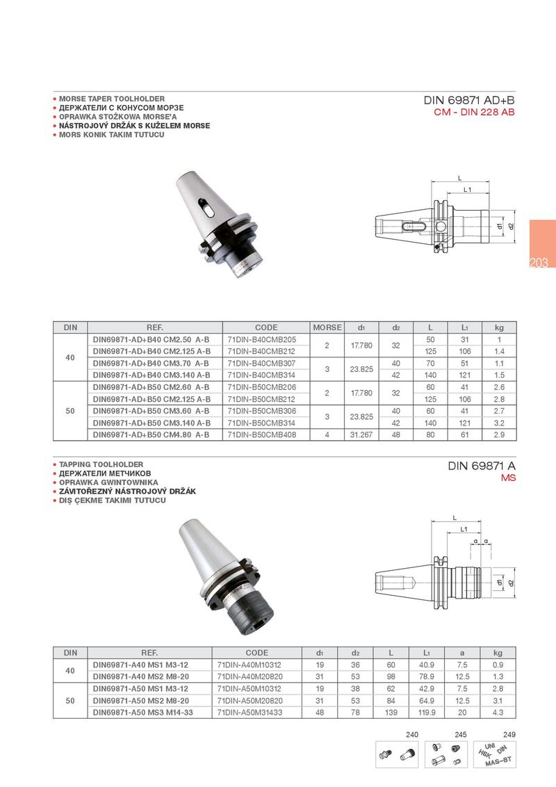 • MORSE TAPER TOOLHOLDER DIN 69871 AD+B • ДЕРЖАТЕЛИ С КОНУСОМ МОРЗЕ CM - DIN 228 AB • OPRAWKA STO¾KOWA MORSE’A • NÁSTROJOV¹ DR½ÁK S KU½ELEM MORSE • MORS KONIK TAKIM TUTUCU 203 DIN REF. CODE MORSE d1 d2 L L1 kg DIN69871-AD+B40 CM2.50 A-B 71DIN-B40CMB205 2 17.780 32 50 31 1 40 DIN69871-AD+B40 CM2.125 A-B 71DIN-B40CMB212 125 106 1.4 DIN69871-AD+B40 CM3.70 A-B 71DIN-B40CMB307 3 23.825 40 70 51 1.1 DIN69871-AD+B40 CM3.140 A-B 71DIN-B40CMB314 42 140 121 1.5 DIN69871-AD+B50 CM2.60 A-B 71DIN-B50CMB206 2 17.780 32 60 41 2.6 DIN69871-AD+B50 CM2.125 A-B 71DIN-B50CMB212 125 106 2.8 50 DIN69871-AD+B50 CM3.60 A-B 71DIN-B50CMB306 3 23.825 40 60 41 2.7 DIN69871-AD+B50 CM3.140 A-B 71DIN-B50CMB314 42 140 121 3.2 DIN69871-AD+B50 CM4.80 A-B 71DIN-B50CMB408 4 31.267 48 80 61 2.9 • TAPPING TOOLHOLDER DIN 69871 A • ДЕРЖАТЕЛИ МЕТЧИКОВ MS • OPRAWKA GWINTOWNIKA • ZÁVITO¢EZN¹ NÁSTROJOV¹ DR½ÁK • DI§ qEKME TAKIMI TUTUCU DIN REF. CODE d1 d2 L L1 a kg 40 DIN69871-A40 MS1 M3-12 71DIN-A40M10312 19 36 60 40.9 7.5 0.9 DIN69871-A40 MS2 M8-20 71DIN-A40M20820 31 53 98 78.9 12.5 1.3 DIN69871-A50 MS1 M3-12 71DIN-A50M10312 19 38 62 42.9 7.5 2.8 50 DIN69871-A50 MS2 M8-20 71DIN-A50M20820 31 53 84 64.9 12.5 3.1 DIN69871-A50 MS3 M14-33 71DIN-A50M31433 48 78 139 119.9 20 4.3 240 245 249