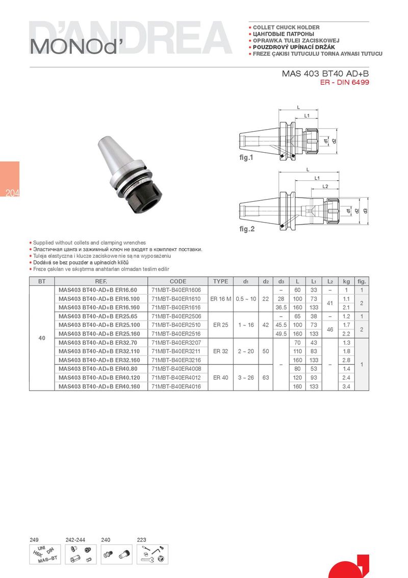 • COLLET CHUCK HOLDER • ЦАНГОВЫЕ ПАТРОНЫ MONOd’ • OPRAWKA TULEI ZACISKOWEJ • POUZDROV¹ UP NAC DR½ÁK • FREZE qAKISI TUTUCULU TORNA AYNASI TUTUCU MAS 403 BT40 AD+B ER - DIN 6499 fig.1 204 fig.2 • Supplied without collets and clamping wrenches • Эластичная цанга и зажимный ключ не входят в комплект поставки. •7XOHMDHODVW\F]QDLNOXF]H]DFLVNRZHQLHVĝQDZ\SRVDƅHQLX •'RG¾Y¾VHEH]SRX]GHUDXSÊQDFÊFKNOÊĦƀ •)UH]HÄDNIJODUIJYHVIJNIJūWIJUPDDQDKWDUODUIJROPDGDQWHVOLPHGLOLU BT REF. CODE TYPE d1 d2 d3 L L1 L2 kg fig. MAS403 BT40-AD+B ER16.60 71MBT-B40ER1606 t 60 33 t 1 1 MAS403 BT40-AD+B ER16.100 71MBT-B40ER1610 ER 16 M 0.5 ~ 10 22 28 100 73 41 1.1 2 MAS403 BT40-AD+B ER16.160 71MBT-B40ER1616 36.5 160 133 2.1 MAS403 BT40-AD+B ER25.65 71MBT-B40ER2506 t 65 38 t 1.2 1 MAS403 BT40-AD+B ER25.100 71MBT-B40ER2510 ER 25 1 ~ 16 42 45.5 100 73 46 1.7 2 40 MAS403 BT40-AD+B ER25.160 71MBT-B40ER2516 49.5 160 133 2.2 MAS403 BT40-AD+B ER32.70 71MBT-B40ER3207 70 43 1.3 MAS403 BT40-AD+B ER32.110 71MBT-B40ER3211 ER 32 2 ~ 20 50 110 83 1.8 MAS403 BT40-AD+B ER32.160 71MBT-B40ER3216 t 160 133 t 2.8 1 MAS403 BT40-AD+B ER40.80 71MBT-B40ER4008 80 53 1.4 MAS403 BT40-AD+B ER40.120 71MBT-B40ER4012 ER 40 3 ~ 26 63 120 93 2.4 MAS403 BT40-AD+B ER40.160 71MBT-B40ER4016 160 133 3.4 249 242-244 240 223