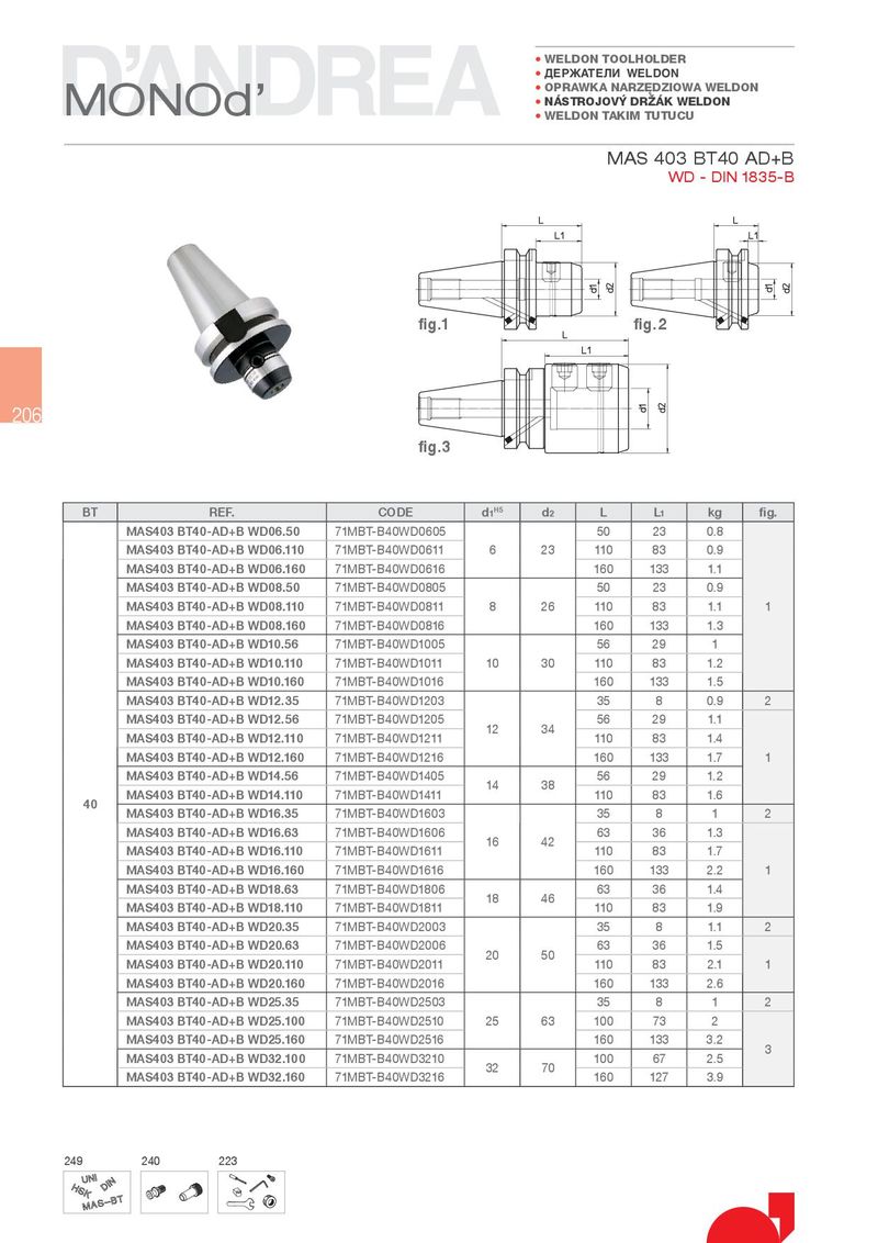 • WELDON TOOLHOLDER • ДЕРЖАТЕЛИ WELDON MONOd’ • OPRAWKA NARZ}DZIOWA WELDON • NÁSTROJOV¹ DR½ÁK WELDON • WELDON TAKIM TUTUCU MAS 403 BT40 AD+B WD - DIN 1835-B fig.1 fig.2 206 fig.3 BT REF. CODE d1H5 d2 L L1 kg fig. MAS403 BT40-AD+B WD06.50 71MBT-B40WD0605 50 23 0.8 MAS403 BT40-AD+B WD06.110 71MBT-B40WD0611 6 23 110 83 0.9 MAS403 BT40-AD+B WD06.160 71MBT-B40WD0616 160 133 1.1 MAS403 BT40-AD+B WD08.50 71MBT-B40WD0805 50 23 0.9 MAS403 BT40-AD+B WD08.110 71MBT-B40WD0811 8 26 110 83 1.1 1 MAS403 BT40-AD+B WD08.160 71MBT-B40WD0816 160 133 1.3 MAS403 BT40-AD+B WD10.56 71MBT-B40WD1005 56 29 1 MAS403 BT40-AD+B WD10.110 71MBT-B40WD1011 10 30 110 83 1.2 MAS403 BT40-AD+B WD10.160 71MBT-B40WD1016 160 133 1.5 MAS403 BT40-AD+B WD12.35 71MBT-B40WD1203 35 8 0.9 2 MAS403 BT40-AD+B WD12.56 71MBT-B40WD1205 12 34 56 29 1.1 MAS403 BT40-AD+B WD12.110 71MBT-B40WD1211 110 83 1.4 MAS403 BT40-AD+B WD12.160 71MBT-B40WD1216 160 133 1.7 1 MAS403 BT40-AD+B WD14.56 71MBT-B40WD1405 14 38 56 29 1.2 40 MAS403 BT40-AD+B WD14.110 71MBT-B40WD1411 110 83 1.6 MAS403 BT40-AD+B WD16.35 71MBT-B40WD1603 35 8 1 2 MAS403 BT40-AD+B WD16.63 71MBT-B40WD1606 16 42 63 36 1.3 MAS403 BT40-AD+B WD16.110 71MBT-B40WD1611 110 83 1.7 MAS403 BT40-AD+B WD16.160 71MBT-B40WD1616 160 133 2.2 1 MAS403 BT40-AD+B WD18.63 71MBT-B40WD1806 18 46 63 36 1.4 MAS403 BT40-AD+B WD18.110 71MBT-B40WD1811 110 83 1.9 MAS403 BT40-AD+B WD20.35 71MBT-B40WD2003 35 8 1.1 2 MAS403 BT40-AD+B WD20.63 71MBT-B40WD2006 20 50 63 36 1.5 MAS403 BT40-AD+B WD20.110 71MBT-B40WD2011 110 83 2.1 1 MAS403 BT40-AD+B WD20.160 71MBT-B40WD2016 160 133 2.6 MAS403 BT40-AD+B WD25.35 71MBT-B40WD2503 35 8 1 2 MAS403 BT40-AD+B WD25.100 71MBT-B40WD2510 25 63 100 73 2 MAS403 BT40-AD+B WD25.160 71MBT-B40WD2516 160 133 3.2 3 MAS403 BT40-AD+B WD32.100 71MBT-B40WD3210 32 70 100 67 2.5 MAS403 BT40-AD+B WD32.160 71MBT-B40WD3216 160 127 3.9 249 240 223