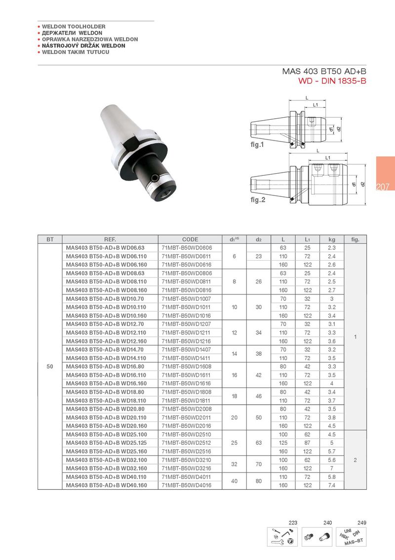 • WELDON TOOLHOLDER • ДЕРЖАТЕЛИ WELDON • OPRAWKA NARZ}DZIOWA WELDON • NÁSTROJOV¹ DR½ÁK WELDON • WELDON TAKIM TUTUCU MAS 403 BT50 AD+B WD - DIN 1835-B fig.1 207 fig.2 BT REF. CODE d1H5 d2 L L1 kg fig. MAS403 BT50-AD+B WD06.63 71MBT-B50WD0606 63 25 2.3 MAS403 BT50-AD+B WD06.110 71MBT-B50WD0611 6 23 110 72 2.4 MAS403 BT50-AD+B WD06.160 71MBT-B50WD0616 160 122 2.6 MAS403 BT50-AD+B WD08.63 71MBT-B50WD0806 63 25 2.4 MAS403 BT50-AD+B WD08.110 71MBT-B50WD0811 8 26 110 72 2.5 MAS403 BT50-AD+B WD08.160 71MBT-B50WD0816 160 122 2.7 MAS403 BT50-AD+B WD10.70 71MBT-B50WD1007 70 32 3 MAS403 BT50-AD+B WD10.110 71MBT-B50WD1011 10 30 110 72 3.2 MAS403 BT50-AD+B WD10.160 71MBT-B50WD1016 160 122 3.4 MAS403 BT50-AD+B WD12.70 71MBT-B50WD1207 70 32 3.1 MAS403 BT50-AD+B WD12.110 71MBT-B50WD1211 12 34 110 72 3.3 1 MAS403 BT50-AD+B WD12.160 71MBT-B50WD1216 160 122 3.6 MAS403 BT50-AD+B WD14.70 71MBT-B50WD1407 14 38 70 32 3.2 MAS403 BT50-AD+B WD14.110 71MBT-B50WD1411 110 72 3.5 50 MAS403 BT50-AD+B WD16.80 71MBT-B50WD1608 80 42 3.3 MAS403 BT50-AD+B WD16.110 71MBT-B50WD1611 16 42 110 72 3.5 MAS403 BT50-AD+B WD16.160 71MBT-B50WD1616 160 122 4 MAS403 BT50-AD+B WD18.80 71MBT-B50WD1808 18 46 80 42 3.4 MAS403 BT50-AD+B WD18.110 71MBT-B50WD1811 110 72 3.7 MAS403 BT50-AD+B WD20.80 71MBT-B50WD2008 80 42 3.5 MAS403 BT50-AD+B WD20.110 71MBT-B50WD2011 20 50 110 72 3.8 MAS403 BT50-AD+B WD20.160 71MBT-B50WD2016 160 122 4.5 MAS403 BT50-AD+B WD25.100 71MBT-B50WD2510 100 62 4.5 MAS403 BT50-AD+B WD25.125 71MBT-B50WD2512 25 63 125 87 5 MAS403 BT50-AD+B WD25.160 71MBT-B50WD2516 160 122 5.7 MAS403 BT50-AD+B WD32.100 71MBT-B50WD3210 32 70 100 62 5.6 2 MAS403 BT50-AD+B WD32.160 71MBT-B50WD3216 160 122 7 MAS403 BT50-AD+B WD40.110 71MBT-B50WD4011 40 80 110 72 5.8 MAS403 BT50-AD+B WD40.160 71MBT-B50WD4016 160 122 7.4 223 240 249