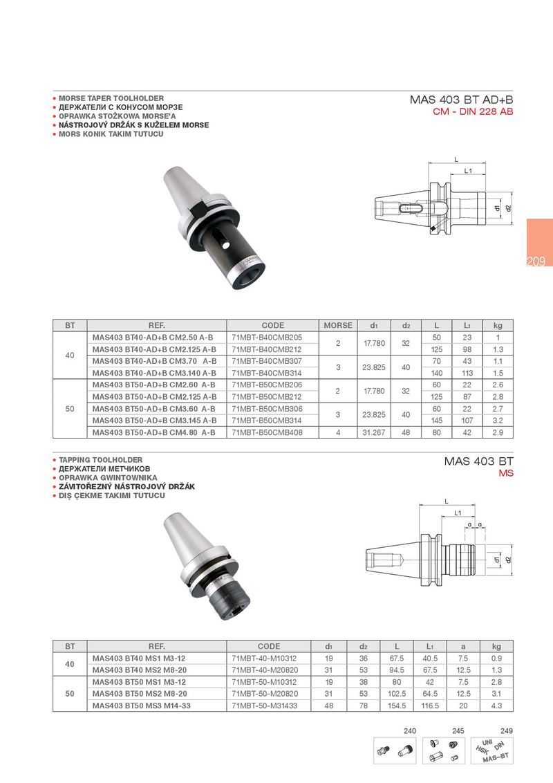 • MORSE TAPER TOOLHOLDER MAS 403 BT AD+B • ДЕРЖАТЕЛИ С КОНУСОМ МОРЗЕ CM - DIN 228 AB • OPRAWKA STO¾KOWA MORSE’A • NÁSTROJOV¹ DR½ÁK S KU½ELEM MORSE • MORS KONIK TAKIM TUTUCU 209 BT REF. CODE MORSE d1 d2 L L1 kg MAS403 BT40-AD+B CM2.50 A-B 71MBT-B40CMB205 2 17.780 32 50 23 1 40 MAS403 BT40-AD+B CM2.125 A-B 71MBT-B40CMB212 125 98 1.3 MAS403 BT40-AD+B CM3.70 A-B 71MBT-B40CMB307 3 23.825 40 70 43 1.1 MAS403 BT40-AD+B CM3.140 A-B 71MBT-B40CMB314 140 113 1.5 MAS403 BT50-AD+B CM2.60 A-B 71MBT-B50CMB206 2 17.780 32 60 22 2.6 MAS403 BT50-AD+B CM2.125 A-B 71MBT-B50CMB212 125 87 2.8 50 MAS403 BT50-AD+B CM3.60 A-B 71MBT-B50CMB306 3 23.825 40 60 22 2.7 MAS403 BT50-AD+B CM3.145 A-B 71MBT-B50CMB314 145 107 3.2 MAS403 BT50-AD+B CM4.80 A-B 71MBT-B50CMB408 4 31.267 48 80 42 2.9 • TAPPING TOOLHOLDER MAS 403 BT • ДЕРЖАТЕЛИ МЕТЧИКОВ MS • OPRAWKA GWINTOWNIKA • ZÁVITO¢EZN¹ NÁSTROJOV¹ DR½ÁK • DI§ qEKME TAKIMI TUTUCU BT REF. CODE d1 d2 L L1 a kg 40 MAS403 BT40 MS1 M3-12 71MBT-40-M10312 19 36 67.5 40.5 7.5 0.9 MAS403 BT40 MS2 M8-20 71MBT-40-M20820 31 53 94.5 67.5 12.5 1.3 MAS403 BT50 MS1 M3-12 71MBT-50-M10312 19 38 80 42 7.5 2.8 50 MAS403 BT50 MS2 M8-20 71MBT-50-M20820 31 53 102.5 64.5 12.5 3.1 MAS403 BT50 MS3 M14-33 71MBT-50-M31433 48 78 154.5 116.5 20 4.3 240 245 249