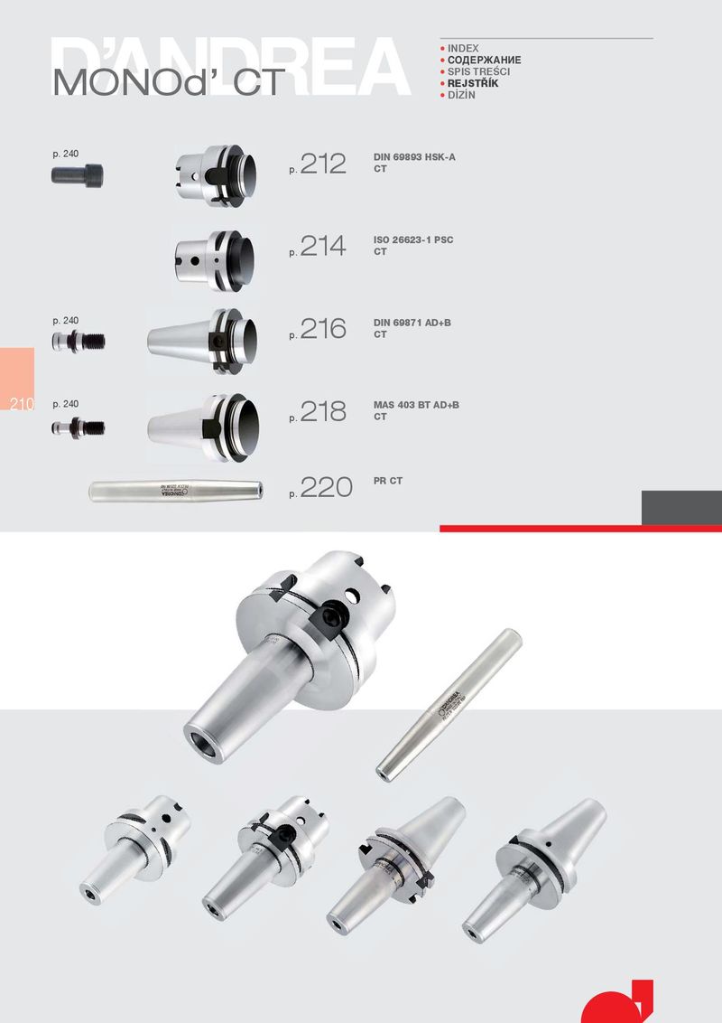 • INDEX • СОДЕРЖАНИЕ MONOd’ CT • SPIS TREùCI • REJST¢ K • Dá9áN p. 240 p. 212 DIN 69893 HSK-A CT p. 214 ISO 26623-1 PSC CT p. 240 p. 216 DIN 69871 AD+B CT 210 p. 240 p. 218 MAS 403 BT AD+B CT p. 220 PR CT