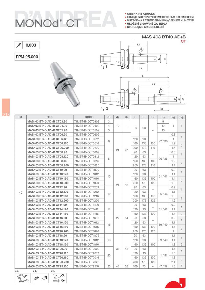 • SHRINK FIT CHUCKS • ØÏÈÍÄÅËÈ Ñ ÒÅÐÌÈ×ÅÑÊÈÌ ÊËÈÍÎÂÛÌ ÑÎÅÄÈÍÅÍÈÅÌ MONOd’ CT • WRZECIONA Z TERMICZNYM POkCZENIEM KLINOWYM • ULO½EN LISOVANÉ ZA TEPLA • SIKI GEqME MANDRENLER MAS 403 BT40 AD+B CT 0.003 RPM 25.000 fig.1 fig.2 218 BT REF. CODE d1 d2 d3 L L1 L2 L3 kg fig. MAS403 BT40-AD+B CT03.90 71MBT-B40CT0309 3 9 MAS403 BT40-AD+B CT04.90 71MBT-B40CT0409 4 10 _ 90 63 12 1 1 MAS403 BT40-AD+B CT05.90 71MBT-B40CT0509 5 – 15 MAS403 BT40-AD+B CT06.90 71MBT-B40CT0609 0.8 1 MAS403 BT40-AD+B CT06.120 71MBT-B40CT0612 6 120 93 22 / 36 1 MAS403 BT40-AD+B CT06.160 71MBT-B40CT0616 160 133 100 1.2 2 MAS403 BT40-AD+B CT06.200 71MBT-B40CT0620 21 27 200 173 110 1.7 MAS403 BT40-AD+B CT08.90 71MBT-B40CT0809 90 63 – 0.8 1 MAS403 BT40-AD+B CT08.120 71MBT-B40CT0812 8 120 93 26 / 36 1 MAS403 BT40-AD+B CT08.160 71MBT-B40CT0816 160 133 100 1.2 2 MAS403 BT40-AD+B CT08.200 71MBT-B40CT0820 200 173 110 1.7 MAS403 BT40-AD+B CT10.90 71MBT-B40CT1009 90 63 – 0.9 1 MAS403 BT40-AD+B CT10.120 71MBT-B40CT1012 10 120 93 31 / 41 1.1 MAS403 BT40-AD+B CT10.160 71MBT-B40CT1016 160 133 100 1.4 2 MAS403 BT40-AD+B CT10.200 71MBT-B40CT1020 24 32 200 173 125 1.9 MAS403 BT40-AD+B CT12.90 71MBT-B40CT1209 90 63 – 0.9 1 40 MAS403 BT40-AD+B CT12.120 71MBT-B40CT1212 12 120 93 36 / 46 1.1 MAS403 BT40-AD+B CT12.160 71MBT-B40CT1216 160 133 100 1.3 2 MAS403 BT40-AD+B CT12.200 71MBT-B40CT1220 200 173 125 1.9 MAS403 BT40-AD+B CT14.90 71MBT-B40CT1409 90 63 – 0.9 1 MAS403 BT40-AD+B CT14.120 71MBT-B40CT1412 14 120 93 31 / 41 1.1 MAS403 BT40-AD+B CT14.160 71MBT-B40CT1416 160 133 100 1.4 2 MAS403 BT40-AD+B CT16.90 71MBT-B40CT1609 27 34 90 63 – 0.9 1 MAS403 BT40-AD+B CT16.120 71MBT-B40CT1612 16 120 93 39 / 49 1.1 MAS403 BT40-AD+B CT16.160 71MBT-B40CT1616 160 133 100 1.4 2 MAS403 BT40-AD+B CT16.200 71MBT-B40CT1620 200 173 125 2 MAS403 BT40-AD+B CT18.90 71MBT-B40CT1809 90 63 – 1.1 1 MAS403 BT40-AD+B CT18.120 71MBT-B40CT1812 18 120 93 39 / 49 1.4 MAS403 BT40-AD+B CT18.160 71MBT-B40CT1816 160 133 100 1.8 2 MAS403 BT40-AD+B CT20.90 71MBT-B40CT2009 33 42 90 63 – 1.4 1 MAS403 BT40-AD+B CT20.120 71MBT-B40CT2012 20 120 93 41 / 51 1.3 MAS403 BT40-AD+B CT20.160 71MBT-B40CT2016 160 133 100 1.8 2 MAS403 BT40-AD+B CT20.200 71MBT-B40CT2020 200 173 125 2.4 MAS403 BT40-AD+B CT25.100 71MBT-B40CT2510 25 44 53 100 73 – 47 / 57 1.8 1 249 240