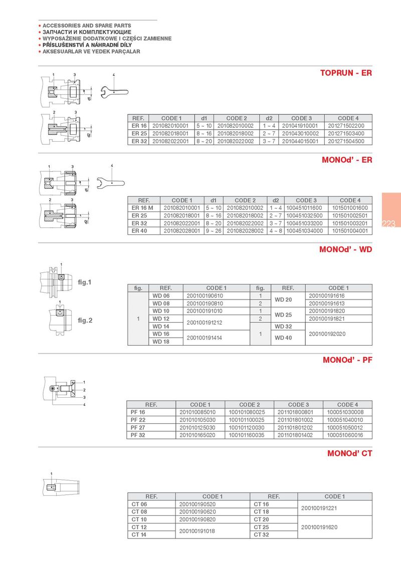 • ACCESSORIES AND SPARE PARTS • ЗАПЧАСТИ И КОМПЛЕКТУЮЩИЕ • WYPOSA¾ENIE DODATKOWE I CZ}¤CI ZAMIENNE • P¢ SLU¦ENSTV A NÁHRADN D LY • AKSESUARLAR VE YEDEK PARÇALAR TOPRUN - ER REF. CODE 1 d1 CODE 2 d2 CODE 3 CODE 4 ER 16 a a ER 25 a a ER 32 a a MONOd’ - ER REF. CODE 1 d1 CODE 2 d2 CODE 3 CODE 4 ER 16 M a a ER 25 a a ER 32 a a 223 ER 40 a a MONOd’ - WD fig.1 fig. REF. CODE 1 fig. REF. CODE 1 WD 06 WD 20 WD 08 2 WD 10 WD 25 fig.2 WD 12 2 WD 14 WD 32 WD 16 WD 40 WD 18 MONOd’ - PF REF. CODE 1 CODE 2 CODE 3 CODE 4 PF 16 PF 22 PF 27 PF 32 MONOd’ CT REF. CODE 1 REF. CODE 1 CT 06 CT 16 CT 08 CT 18 CT 10 CT 20 CT 12 CT 25 CT 14 CT 32