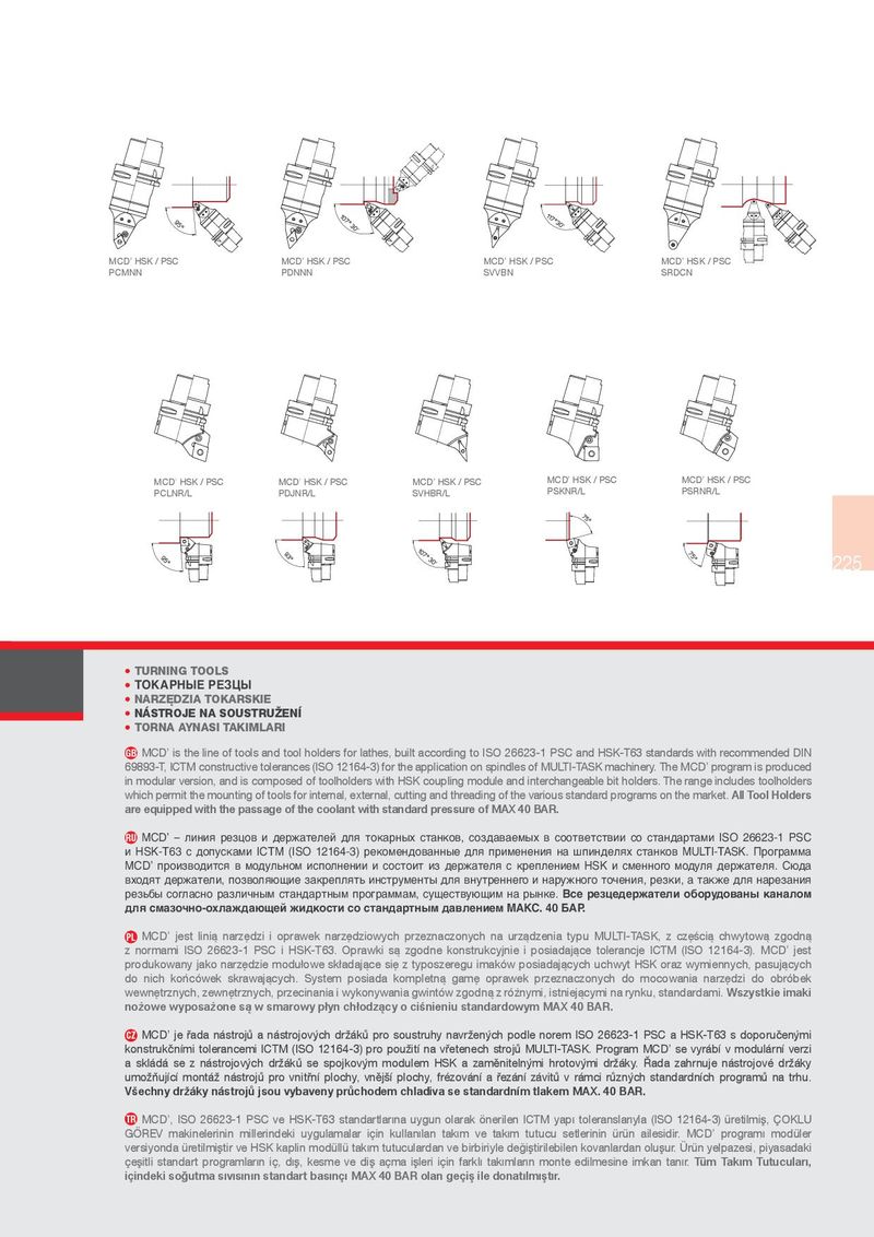 MCD’ HSK / PSC MCD’ HSK / PSC MCD’ HSK / PSC MCD’ HSK / PSC PCMNN PDNNN SVVBN SRDCN MCD' HSK / PSC MCD' HSK / PSC MCD’ HSK / PSC MCD’ HSK / PSC MCD’ HSK / PSC PCLNR/L PDJNR/L SVHBR/L PSKNR/L PSRNR/L 225 • TURNING TOOLS • ТОКАРНЫЕ РЕЗЦЫ • NARZ}DZIA TOKARSKIE • NÁSTROJE NA SOUSTRU½EN • TORNA AYNASI TAKIMLARI GB MCD’ is the line of tools and tool holders for lathes, built according to ISO 26623-1 PSC and HSK-T63 standards with recommended DIN 69893-T, ICTM constructive tolerances (ISO 12164-3) for the application on spindles of MULTI-TASK machinery. The MCD’ program is produced in modular version, and is composed of toolholders with HSK coupling module and interchangeable bit holders. The range includes toolholders which permit the mounting of tools for internal, external, cutting and threading of the various standard programs on the market. All Tool Holders are equipped with the passage of the coolant with standard pressure of MAX 40 BAR. RU MCD’ – линия резцов и держателей для токарных станков, создаваемых в соответствии со стандартами ISO 26623-1 PSC и HSK-T63 с допусками IСTM (ISO 12164-3) рекомендованные для применения на шпинделях станков MULTI-TASK. Программа MCD’ производится в модульном исполнении и состоит из держателя с креплением HSK и сменного модуля держателя. Сюда входят держатели, позволяющие закреплять инструменты для внутреннего и наружного точения, резки, а также для нарезания резьбы согласно различным стандартным программам, существующим на рынке. Все резцедержатели оборудованы каналом для смазочно-охлаждающей жидкости со стандартным давлением МАКС. 40 БАР. PL 0&'p MHVW OLQLĝ QDU]ĸG]L L RSUDZHN QDU]ĸG]LRZ\FK SU]H]QDF]RQ\FK QD XU]ĝG]HQLD W\SX 08/7,7$6. ] F]ĸŪFLĝ FKZ\WRZĝ ]JRGQĝ ] QRUPDPL ,62 36& L +6.7 2SUDZNL Vĝ ]JRGQH NRQVWUXNF\MQLH L SRVLDGDMĝFH WROHUDQFMH ,&70 ,62 0&'p MHVW SURGXNRZDQ\MDNRQDU]ĸG]LHPRGXŕRZHVNŕDGDMĝFHVLĸ]W\SRV]HUHJXLPDNÐZSRVLDGDMĝF\FKXFKZ\W+6.RUD]Z\PLHQQ\FKSDVXMĝF\FK GR QLFK NRŘFÐZHN VNUDZDMĝF\FK 6\VWHP SRVLDGD NRPSOHWQĝ JDPĸ RSUDZHN SU]H]QDF]RQ\FK GR PRFRZDQLD QDU]ĸG]L GR REUÐEHN ZHZQĸWU]Q\FK]HZQĸWU]Q\FKSU]HFLQDQLDLZ\NRQ\ZDQLDJZLQWÐZ]JRGQĝ]UÐƅQ\PLLVWQLHMĝF\PLQDU\QNXVWDQGDUGDPLWszystkie imaki noŤowe wyposaŤone sƅ w smarowy pyn chodzƅcy o ciōnieniu standardowym MAX 40 BAR. CZ 0&'pMHŦDGDQ¾VWURMƀDQ¾VWURMRYÚFKGU{¾NƀSURVRXVWUXK\QDYU{HQÚFKSRGOHQRUHP,6236&D+6.7VGRSRUXĦHQÚPL NRQVWUXNĦQÊPL WROHUDQFHPL ,&70 ,62 SUR SRX{LWÊ QD YŦHWHQHFK VWURMƀ 08/7,7$6. 3URJUDP 0&'p VH Y\U¾EÊ Y PRGXO¾UQÊ YHU]L D VNO¾G¾ VH ] Q¾VWURMRYÚFK GU{¾Nƀ VH VSRMNRYÚP PRGXOHP +6. D ]DPĵQLWHOQÚPL KURWRYÚPL GU{¾N\ ĆDGD ]DKUQXMH Q¾VWURMRYÆ GU{¾N\ XPR{ŚXMÊFÊ PRQW¾{ Q¾VWURMƀ SUR YQLWŦQÊ SORFK\ YQĵMxÊ SORFK\ IUÆ]RY¾QÊ D ŦH]¾QÊ ]¾YLWƀ Y U¾PFL Uƀ]QÚFK VWDQGDUGQÊFK SURJUDPƀ QD WUKX Vŏechny drţēky nēstroIś Isou vybaveny prśchodem chladiva se standardnım tlakem MAX. 40 BAR. TR 0&'p ,62 36& YH +6.7 VWDQGDUWODUIJQD X\JXQ RODUDN ÓQHULOHQ ,&70 \DSIJ WROHUDQVODUIJ\OD ,62 ÙUHWLOPLū ¤2./8 *³5(9 PDNLQHOHULQLQ PLOOHULQGHNL X\JXODPDODU LÄLQ NXOODQIJODQ WDNIJP YH WDNIJP WXWXFX VHWOHULQLQ ÙUÙQ DLOHVLGLU 0&'p SURJUDPIJ PRGÙOHU YHUVL\RQGDÙUHWLOPLūWLUYH+6.NDSOLQPRGÙOOÙWDNIJPWXWXFXODUGDQYHELUELUL\OHGHĽLūWLULOHELOHQNRYDQODUGDQROXūXU¹UÙQ\HOSD]HVLSL\DVDGDNL ÄHūLWOL VWDQGDUW SURJUDPODUIJQ LÄ GIJū NHVPH YH GLū DÄPD LūOHUL LÄLQ IDUNOIJ WDNIJPODUIJQ PRQWH HGLOPHVLQH LPNDQ WDQIJU TŘm Takm Tutucular, iĞindeki soīutma svsnn standart basnĞ MAX 40 BAR olan geĞiŐ ile donatlmŐtr.