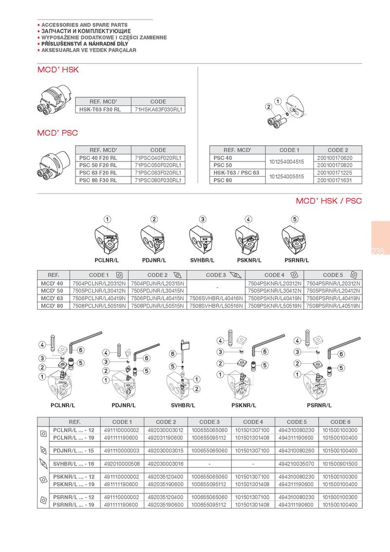 • ACCESSORIES AND SPARE PARTS • ЗАПЧАСТИ И КОМПЛЕКТУЮЩИЕ • WYPOSA¾ENIE DODATKOWE I CZ}¤CI ZAMIENNE • P¢ SLU¦ENSTV A NÁHRADN D LY • AKSESUARLAR VE YEDEK PARÇALAR MCD’ HSK REF. MCD’ CODE HSK-T63 F30 RL 71HSKA63F030RL1 MCD’ PSC REF. MCD’ CODE REF. MCD’ CODE 1 CODE 2 PSC 40 F20 RL 71PSC040F020RL1 PSC 40 101254004515 200100170620 PSC 50 F20 RL 71PSC050F020RL1 PSC 50 200100170820 PSC 63 F20 RL 71PSC063F020RL1 HSK-T63 / PSC 63 101254005515 200100171225 PSC 80 F30 RL 71PSC080F030RL1 PSC 80 200100171631 MCD’ HSK / PSC 235 PCLNR/L PD)NR/L SVHBR/L PSKNR/L PSRNR/L REF. CODE 1 CODE 2 CODE 3 CODE 4 CODE 5 MCD’ 40 7504PCLNR/L20312N 7504PDJNR/L20315N - 7504PSKNR/L20312N 7504PSRNR/L20312N MCD’ 50 7505PCLNR/L30412N 7505PDJNR/L30415N 7505PSKNR/L30412N 7505PSRNR/L20412N MCD’ 63 7506PCLNR/L40419N 7506PDJNR/L40415N 7506SVHBR/L40416N 7506PSKNR/L40419N 7506PSRNR/L40419N MCD’ 80 7508PCLNR/L50519N 7508PDJNR/L50515N 7508SVHBR/L50516N 7508PSKNR/L50519N 7508PSRNR/L40519N PCLNR/L PD)NR/L SVHBR/L PSKNR/L PSRNR/L REF. CODE 1 CODE 2 CODE 3 CODE 4 CODE 5 CODE 6 PCLNR/L ... - 12 491110000002 492030003012 100655065060 101501307100 494310080230 101500100300 PCLNR/L ... - 19 491111190600 492031190600 100655095112 101501301408 494311190600 101500100400 PD)NR/L ... - 15 491110000003 492030003015 100655065060 101501307100 494310080260 101500100400 SVHBR/L ... - 16 492010000508 492030003016 - - 494210035070 101500901500 PSKNR/L ... - 12 491110000002 492035120400 100655065060 101501307100 494310080230 101500100300 PSKNR/L ... - 19 491111190600 492035190600 100655095112 101501301408 494311190600 101500100400 PSRNR/L ... - 12 491110000002 492035120400 100655065060 101501307100 494310080230 101500100300 PSRNR/L ... - 19 491111190600 492035190600 100655095112 101501301408 494311190600 101500100400