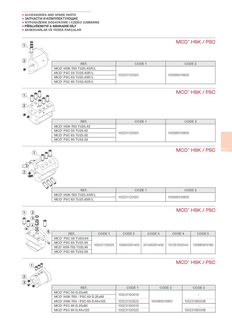 • ACCESSORIES AND SPARE PARTS • ЗАПЧАСТИ И КОМПЛЕКТУЮЩИЕ • WYPOSA¾ENIE DODATKOWE I CZ}¤CI ZAMIENNE • P¢ SLU¦ENSTV A NÁHRADN D LY • AKSESUARLAR VE YEDEK PARÇALAR MCD’ HSK / PSC REF. CODE 1 CODE 2 MCD’ HSK-T63 TU25.45R/L MCD’ PSC 50 TU20.45R/L 100231120025 100585010800 MCD’ PSC 63 TU25.45R/L MCD’ PSC 80 TU32.45R/L MCD’ HSK / PSC REF. CODE 1 CODE 2 MCD’ HSK-T63 TU25.02 MCD’ PSC 50 TU20.02 100231120025 100585010800 MCD’ PSC 63 TU25.02 MCD’ PSC 80 TU32.02 MCD’ HSK / PSC 237 REF. CODE 1 CODE 2 MCD’ HSK-T63 TU25.03R/L 100231120025 100585010800 MCD' PSC 63 TU25.03R/L MCD’ HSK / PSC REF. CODE 1 CODE 2 CODE 3 CODE 4 CODE 5 MCD’ PSC 50 TU20.90 MCD’ PSC 63 TU25.90 100231120025 100900301400 201462501400 101251002043 100580610180 MCD’ HSK-T63 TU25.90 MCD’ PSC 80 TU32.90 MCD’ HSK / PSC REF. CODE 1 CODE 2 CODE 3 MCD’ PSC 50 D.25x80 100231100016 - MCD’ HSK-T63 / PSC 63 D.25x80 MCD’ HSK-T63 / PSC 63 D.40x125 100231120020 100585010800 100231080008 MCD’ PSC 80 D.25x85 100231100016 - MCD’ PSC 80 D.40x125 100231120020 100231080008