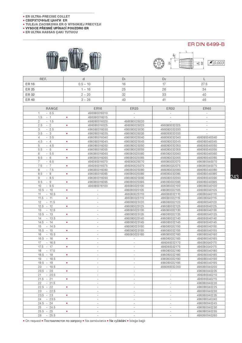 • ER ULTRA-PRECISE COLLET • СВЕРХТОЧНЫЕ ЦАНГИ ER • TULEJA ZACISKOWA ER O WYSOKIEJ PRECYZJI • VYSOCE P¢ESNÉ UP NAC POUZDRO ER • ER ULTRA HASSAS ÇAKI TUTUCU ER DIN 6499-B REF. d D1 D2 L ER 16 0.5 ~ 10 16 17 27.5 ER 25 1 ~ 16 25 26 34 ER 32 2 ~ 20 32 33 40 ER 40 3 ~ 26 40 41 46 RANGE ER16 ER25 ER32 ER40 1 - 0.5 496080016010 - - - 1.5 - 1 • 496080016015 - - - 2 - 1.5 496080016020 496080025020 - - 2.5 - 2 • 496080016025 496080025025 496080032025 - 3 - 2.5 496080016030 496080025030 496080032030 - 3.5 - 3 • 496080016035 496080025035 496080032035 - 4 - 3.5 496080016040 496080025040 496080032040 496080040040 4.5 - 4 • 496080016045 496080025045 496080032045 496080040045 5 - 4.5 496080016050 496080025050 496080032050 496080040050 5.5 - 5 • 496080016055 496080025055 496080032055 496080040055 6 - 5.5 496080016060 496080025060 496080032060 496080040060 6.5 - 6 • 496080016065 496080025065 496080032065 496080040065 7 - 6.5 496080016070 496080025070 496080032070 496080040070 7.5 - 7 • 496080016075 496080025075 496080032075 496080040075 8 - 7.5 496080016080 496080025080 496080032080 496080040080 8.5 - 8 • 496080016085 496080025085 496080032085 496080040085 243 9 - 8.5 496080016090 496080025090 496080032090 496080040090 9.5 - 9 • 496080016095 496080025095 496080032095 496080040095 10 - 9.5 496080016100 496080025100 496080032100 496080040100 10.5 - 10 • - 496080025105 496080032105 496080040105 11 - 10.5 - 496080025110 496080032110 496080040110 11.5 - 11 • - 496080025115 496080032115 496080040115 12 - 11.5 - 496080025120 496080032120 496080040120 12.5 - 12 • - 496080025125 496080032125 496080040125 13 - 12.5 - 496080025130 496080032130 496080040130 13.5 - 13 • - 496080025135 496080032135 496080040135 14 - 13.5 - 496080025140 496080032140 496080040140 14.5 - 14 • - 496080025145 496080032145 496080040145 15 - 14.5 - 496080025150 496080032150 496080040150 15.5 - 15 • - 496080025155 496080032155 496080040155 16 - 15.5 - 496080025160 496080032160 496080040160 16.5 - 16 • - - 496080032165 496080040165 17 - 16.5 - - 496080032170 496080040170 17.5 - 17 • - - 496080032175 496080040175 18 - 17.5 - - 496080032180 496080040180 18.5 - 18 • - - 496080032185 496080040185 19 - 18.5 - - 496080032190 496080040190 19.5 - 19 • - - 496080032195 496080040195 20 - 19.5 - - 496080032200 496080040200 20.5 - 20 • - - - 496080040205 21 - 20.5 - - - 496080040210 21.5 - 21 • - - - 496080040215 22 - 21.5 - - - 496080040220 22.5 - 22 • - - - 496080040225 23 - 22.5 - - - 496080040230 23.5 - 23 • - - - 496080040235 24 - 23.5 - - - 496080040240 24.5 - 24 • - - - 496080040245 25 - 24.5 - - - 496080040250 25.5 - 25 • - - - 496080040255 26 - 25.5 - - - 496080040260 • 2QUHTXHVW• Поставляются по запросу • Na zamówienie • 1DY\{¾G¾QÊ•óVWHĽHEDĽOIJ