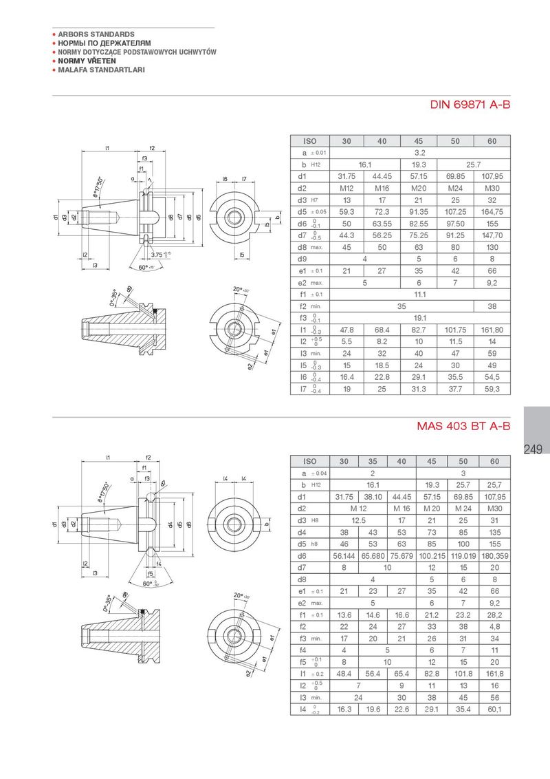 • ARBORS STANDARDS • НОРМЫ ПО ДЕРЖАТЕЛЯМ • NORMY DOTYCZkCE PODSTAWOWYCH UCHWYTÓW • NORMY V¢ETEN • MALAFA STANDARTLARI DIN 69871 A-B ISO 30 40 45 50 60 a ± 0.01 3.2 b H12 16.1 19.3 25.7 d1 31.75 44.45 57.15 69.85 107,95 d2 M12 M16 M20 M24 M30 d3 H7 13 17 21 25 32 d5 ± 0.05 59.3 72.3 91.35 107.25 164,75 d6 0 50 63.55 82.55 97.50 155 -0.1 d7 0 44.3 56.25 75.25 91.25 147,70 -0.5 d8 max. 45 50 63 80 130 d9 4 5 6 8 e1 ± 0.1 21 27 35 42 66 e2 max. 5 6 7 9,2 f1 ± 0.1 11.1 f2 min. 35 38 f3 0 19.1 -0.1 l1 0 47.8 68.4 82.7 101.75 161,80 -0.3 l2 +0.5 5.5 8.2 10 11.5 14 0 l3 min. 24 32 40 47 59 l5 0 15 18.5 24 30 49 -0.3 l6 0 16.4 22.8 29.1 35.5 54,5 -0.4 l7 0 19 25 31.3 37.7 59,3 -0.4 MAS 403 BT A-B 249 ISO 30 35 40 45 50 60 a ± 0.04 2 3 b H12 16.1 19.3 25.7 25,7 d1 31.75 38.10 44.45 57.15 69.85 107,95 d2 M 12 M 16 M 20 M 24 M30 d3 H8 12.5 17 21 25 31 d4 38 43 53 73 85 135 d5 h8 46 53 63 85 100 155 d6 56.144 65.680 75.679 100.215 119.019 180,359 d7 8 10 12 15 20 d8 4 5 6 8 e1 ± 0.1 21 23 27 35 42 66 e2 max. 5 6 7 9,2 f1 ± 0.1 13.6 14.6 16.6 21.2 23.2 28,2 f2 22 24 27 33 38 4,8 f3 min. 17 20 21 26 31 34 f4 4 5 6 7 11 f5 +0.1 8 10 12 15 20 0 l1 ± 0.2 48.4 56.4 65.4 82.8 101.8 161,8 l2 +0.5 7 9 11 13 16 0 l3 min. 24 30 38 45 56 l4 0 16.3 19.6 22.6 29.1 35.4 60,1 -0.2