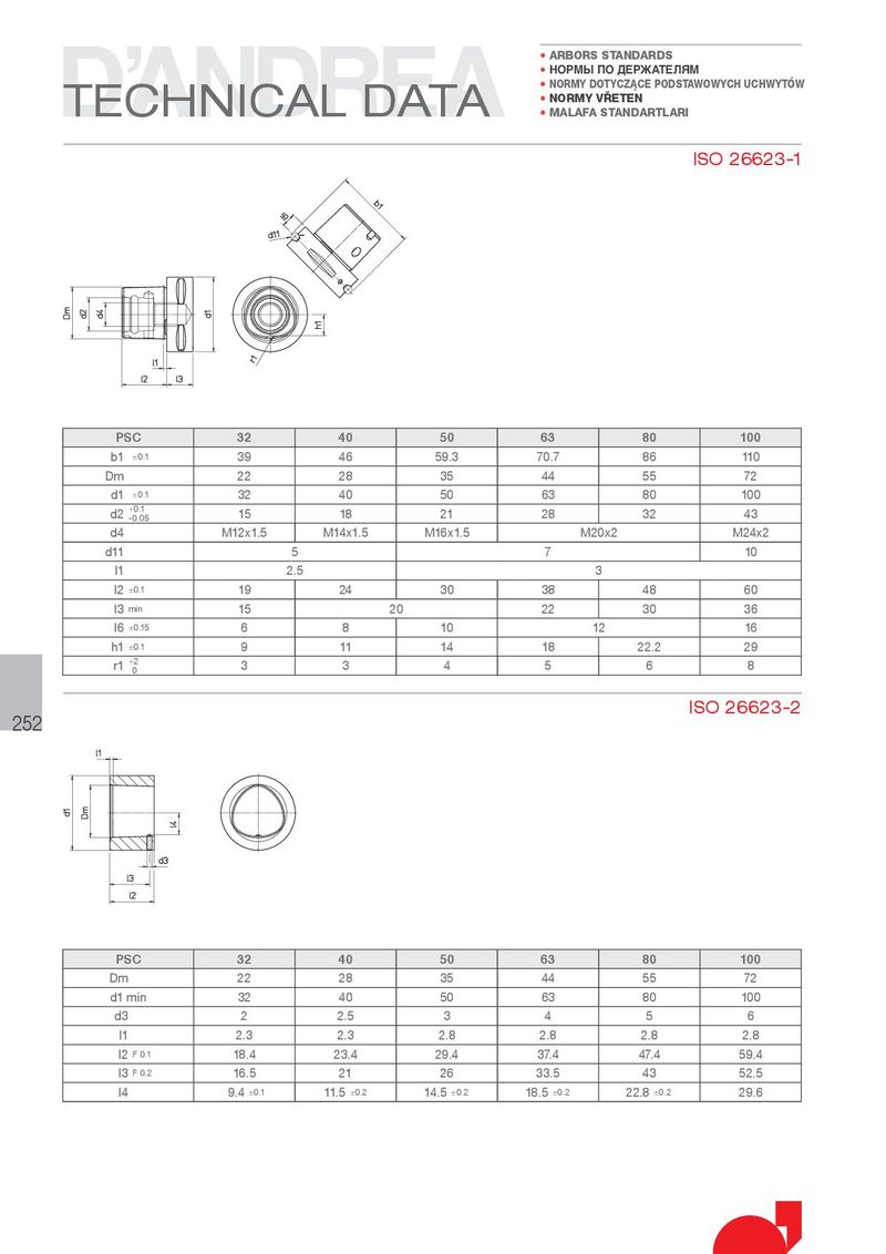 • ARBORS STANDARDS • НОРМЫ ПО ДЕРЖАТЕЛЯМ TECHNICAL DATA • NORMY DOTYCZkCE PODSTAWOWYCH UCHWYTÓW • NORMY V¢ETEN • MALAFA STANDARTLARI ISO 26623-1 PSC 32 40 50 63 80 100 b1 ±0.1 39 46 59.3 70.7 86 110 Dm 22 28 35 44 55 72 d1 ±0.1 32 40 50 63 80 100 d2 +0.1 15 18 21 28 32 43 -0.05 d4 M12x1.5 M14x1.5 M16x1.5 M20x2 M24x2 d11 5 7 10 l1 2.5 3 l2 ±0.1 19 24 30 38 48 60 l3 min 15 20 22 30 36 l6 ±0.15 6 8 10 12 16 h1 ±0.1 9 11 14 18 22.2 29 r1 +2 3 3 4 5 6 8 0 252 ISO 26623-2 PSC 32 40 50 63 80 100 Dm 22 28 35 44 55 72 d1 min 32 40 50 63 80 100 d3 2 2.5 3 4 5 6 l1 2.3 2.3 2.8 2.8 2.8 2.8 l2 F 0.1 18.4 23.4 29.4 37.4 47.4 59.4 l3 F 0.2 16.5 21 26 33.5 43 52.5 l4 9.4 ±0.1 11.5 ±0.2 14.5 ±0.2 18.5 ±0.2 22.8 ±0.2 29.6