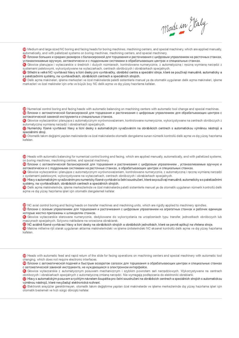 GB Medium and large sized NC boring and facing heads for boring machines, machining centers, and special machinery, which are applied manually, automatically, and with palletized systems on boring machines, machining centers, and special machinery. RU Головки больших и средних размеров с балансировкой для торцевания и растачивания с цифровым управлением на расточных станках, устанавливаемые вручную, автоматически и с поддонными системами в обрабатывающих центрах и специальных станках. PL *ŕRZLFH SODQXMĝFH L Z\WDF]DUVNLH R ŪUHGQLFK L GXƅ\FK UR]PLDUDFK NRQWURORZDQH QXPHU\F]QLH ] DXWRPDW\F]Qĝ L UĸF]Qĝ Z\PLDQĝ QDU]ĸG]L ] V\VWHPDPLSDOHWRZ\PLZ\NRU]\VW\ZDQHQDZ\WDF]DUNDFKFHQWUDFKREUÐEF]\FKLREUDELDUNDFKVSHFMDOQ\FK CZ 6WŦHGQÊDYHONÆ1&Y\YUW¾YDFÊKODY\DOÊFQÊGHVN\SURY\YUW¾YDĦN\REU¾EĵFÊFHQWUDDVSHFL¾OQÊVWURMHNWHUÆVHSRX{ÊYDMÊPDQX¾OQĵDXWRPDWLFN\D VSDOHWL]DĦQÊPLV\VWÆP\QDY\YUW¾YDĦN¾FKREU¾EĵFÊFKFHQWUHFKDVSHFL¾OQÊFKVWURMÊFK TR 'HOLNDÄPDPDNLQHOHULLūOHPHPHUNH]OHULYHÓ]HOPDNLQHOHUGHSDOHWOLVLVWHPOHUOHPDQXHO\DGDRWRPDWLNX\JXODQDQGHOLNDÄPDPDNLQHOHULLūOHPH PHUNH]OHULYHÓ]HOPDNLQHOHULÄLQRUWDYHEÙ\ÙNER\1&GHOLNDÄPDYHGIJū\Ù]H\KD]IJUODPDNDIDODUIJ GB Numerical control boring and facing heads with automatic balancing on machining centers with automatic tool change and special machines. RU Головки с автоматической балансировкой для торцевания и растачивания с цифровым управлением для обрабатывающих центров с автоматической заменой инструмента и специальных станков. PL *ŕRZLFHZ\WDF]DUVNLHLSODQXMĝFH]DXWRPDW\F]Q\PZ\UÐZQRZDƅHQLHPNRQWURORZDQHQXPHU\F]QLHZ\NRU]\VW\ZDQHQDFHQWUDFKREUÐEF]\FK] DXWRPDW\F]QĝZ\PLDQĝQDU]ĸG]LLREUDELDUNDFKVSHFMDOQ\FK CZ 1XPHULFN\ ŦÊ]HQÆ Y\YUW¾YDFÊ KODY\ D OÊFQÊ GHVN\ V DXWRPDWLFNÚP Y\YD{RY¾QÊP QD REU¾EĵFÊFK FHQWUHFK V DXWRPDWLFNRX YÚPĵQRX Q¾VWURMƀ D VSHFL¾OQÊPLVWURML TR 2WRPDWLNWDNIJPGHĽLūLPL\DSIJODQPDNLQHOHUGHYHÓ]HOPDNLQHOHUGHRWRPDWLNGHQJHOHPHVXQDQQÙPHULNNRQWUROOÙGHOLNDÄPDYHGIJū\Ù]H\KD]IJUODPD NDIDODUIJ GB Heads with automatic balancing for numerical control boring and facing, which are applied manually, automatically, and with palletized systems, on boring machines, machining centres, and special machinery. RU Головки с автоматической балансировкой для торцевания и растачивания с цифровым управлением , устанавливаемые вручную и автоматически и с поддонными системами на расточных станках, в обрабатывающих центрах и специальных станках. PL *ŕRZLFHZ\WDF]DUVNLHLSODQXMĝFH]DXWRPDW\F]Q\PZ\UÐZQRZDƅHQLHPNRQWURORZDQHQXPHU\F]QLH]DXWRPDW\F]QĝLUĸF]QĝZ\PLDQĝQDU]ĸG]L ]V\VWHPDPLSDOHWRZ\PLZ\NRU]\VW\ZDQHQDZ\WDF]DUNDFKFHQWUDFKREUÐEF]\FKLREUDELDUNDFKVSHFMDOQ\FK CZ +ODY\VDXWRPDWLFNÚPY\YD{RY¾QÊPSURQXPHULFN\ŦÊ]HQÆY\YUW¾Y¾QÊDĦHOQÊVRXVWUX{HQÊNWHUÆVHSRX{ÊYDMÊPDQX¾OQĵDXWRPDWLFN\DVSDOHWL]DĦQÊPL V\VWÆP\QDY\YUW¾YDĦN¾FKREU¾EĵFÊFKFHQWUHFKDVSHFL¾OQÊFKVWURMÊFK TR 'HOLNDÄPDPDNLQHOHULQGHLūOHPHPHUNH]OHULQGHYHÓ]HOPDNLQHOHUGHSDOHWOLVLVWHPOHUOHPDQXHO\DGDRWRPDWLNX\JXODQDQQÙPHULNNRQWUROOÙGHOLN DÄPDYHGIJū\Ù]H\KD]IJUODPDLūOHULLÄLQRWRPDWLNGHQJHOHPHOLNDIDODU GB NC axial control boring and facing heads on transfer machines and machining units, which are rigidly applied to machinery spindles. RU Головки с осевым управлением для торцевания и растачивания с цифровым управлением на агрегатных станках и рабочих единицах которые жестко прилажены к шпинделям станков. PL *ŕRZLFH Z\WDF]DUVNLH VWHURZDQH QXPHU\F]QLH GHG\NRZDQH GR Z\NRU]\VWDQLD QD XU]ĝG]HQLDFK W\SX WUDQVIHU MHGQRVWNDFK REUÐEF]\FK OXE PDV]\QDFKVSHFMDOQ\FK6]W\ZQRQDNŕDGDQHQDZU]HFLRQDREUDELDUHN CZ 1&D[L¾OQĵŦÊ]HQÆY\YUW¾YDFÊKODY\DOÊFQÊGHVN\QDREU¾EĵFÊFKVWURMÊFKDREU¾EĵFÊFKMHGQRWN¾FKNWHUÆVHSHYQĵDSOLNXMÊQDYŦHWHQDVWURMH TR 0DNLQHPLOOHULQHULMLWRODUDNX\JXODQDQDNWDUPDPDNLQHOHULQGHNLYHLūOHPHÙQLWHOHULQGHNL1&HNVHQHONRQWUROOÙGHOLNDÄPDYHGIJū\Ù]H\KD]IJUODPD NDIDODUIJ GB Heads with automatic feed and rapid return of the slide for facing operations on machining centers and special machinery with automatic tool changing, which does not require electronic interfaces. RU Головки с автоматической подачей и быстрым возвратом салазок для торцевания в обрабатывающих центрах и специальных станках с автоматической заменой инструмента, не нуждающихся в электронном интерфейсе. PL *ŕRZLFH Z\WDF]DUVNLH ] DXWRPDW\F]Q\P SRVXZHP PHFKDQLF]Q\P L V]\ENLP SRZURWHP VDŘ QDU]ĸG]LRZ\FK :\NRU]\VW\ZDQH QD FHQWUDFK REUÐEF]\FKLREUDELDUNDFKVSHFMDOQ\FK]DXWRPDW\F]Qĝ]PLDQĝQDU]ĸG]L1LHZ\PDJDMĝSRGŕĝF]DQLDGRHOHNWURQLNLREUDELDUNL CZ +ODY\VDXWRPDWLFNÚPSRVXYHPDU\FKOÚPQ¾YUDWHPxRXS¾WNDSURĦHOQÊVRXVWUX{HQÊQDREU¾EĵFÊFKFHQWUHFKDVSHFL¾OQÊFKVWURMÊFKVDXWRPDWLFNRX YÚPĵQRXQ¾VWURMƀNWHUÆQHY\{DGXMÊHOHNWURQLFN¾UR]KUDQÊ TR (OHNWURQLNDUD\Ù]OHUJHUHNWLUPH\HQRWRPDWLNWDNIJPGHĽLūWLUPH\DSIJODQÓ]HOPDNLQHOHUGHYHLūOHPHPHUNH]OHULQGHGIJū\Ù]H\KD]IJUODPDLūOHULLÄLQ RWRPDWLNEHVOHPHOLYHKIJ]OIJVÙUJÙGÓQÙūOÙNDIDODU