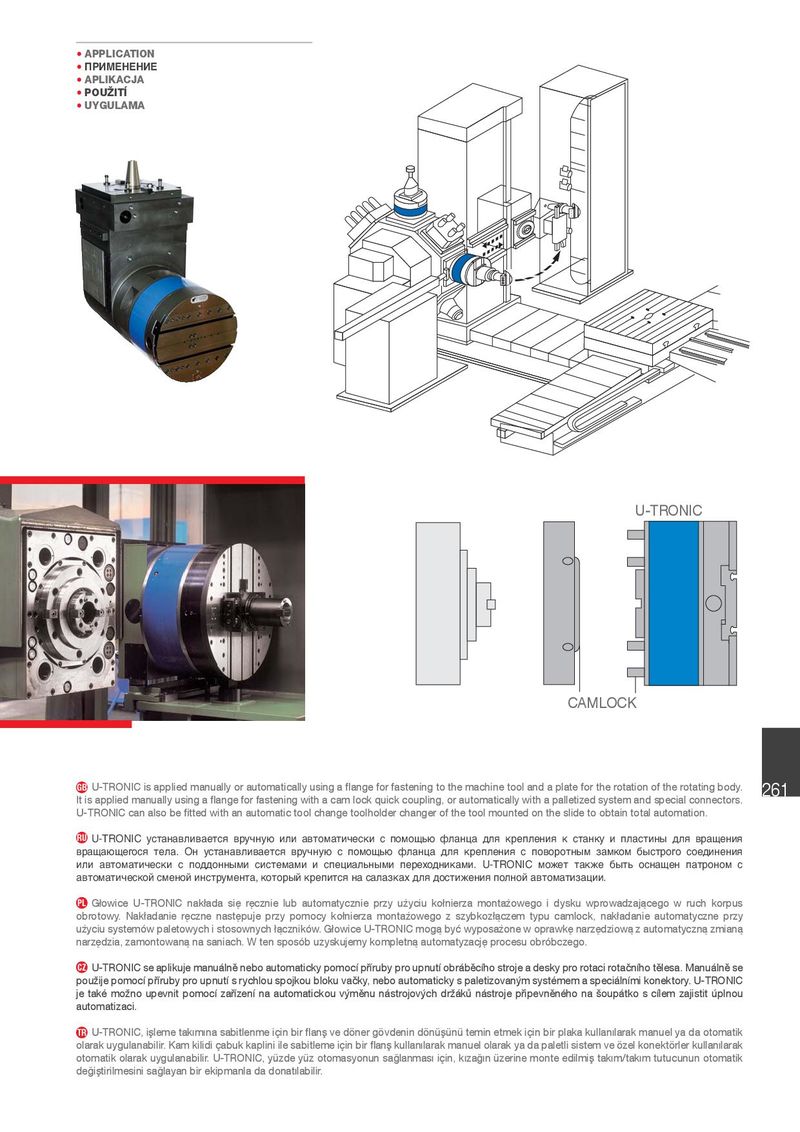 • APPLICATION • ПРИМЕНЕНИЕ • APLIKACJA • POU½IT • UYGULAMA U-TRONIC &$0/2&. GB 87521,&LVDSSOLHGPDQXDOO\RUDXWRPDWLFDOO\XVLQJDĻDQJHIRUIDVWHQLQJWRWKHPDFKLQHWRRODQGDSODWHIRUWKHURWDWLRQRIWKHURWDWLQJERG\ 261 ,WLVDSSOLHGPDQXDOO\XVLQJDĻDQJHIRUIDVWHQLQJZLWKDFDPORFNTXLFNFRXSOLQJRUDXWRPDWLFDOO\ZLWKDSDOOHWL]HGV\VWHPDQGVSHFLDOFRQQHFWRUV 87521,&FDQDOVREHĺWWHGZLWKDQDXWRPDWLFWRROFKDQJHWRROKROGHUFKDQJHURIWKHWRROPRXQWHGRQWKHVOLGHWRREWDLQWRWDODXWRPDWLRQ RU U-TRONIC устанавливается вручную или автоматически с помощью фланца для крепления к станку и пластины для вращения вращающегося тела. Он устанавливается вручную с помощью фланца для крепления с поворотным замком быстрого соединения или автоматически с поддонными системами и специальными переходниками. U-TRONIC может также быть оснащен патроном с автоматической сменой инструмента, который крепится на салазках для достижения полной автоматизации. PL *ŕRZLFH 87521,& QDNŕDGD VLĸ UĸF]QLH OXE DXWRPDW\F]QLH SU]\ Xƅ\FLX NRŕQLHU]D PRQWDƅRZHJR L G\VNX ZSURZDG]DMĝFHJR Z UXFK NRUSXV REURWRZ\ 1DNŕDGDQLH UĸF]QH QDVWĸSXMH SU]\ SRPRF\ NRŕQLHU]D PRQWDƅRZHJR ] V]\ENR]ŕĝF]HP W\SX FDPORFN QDNŕDGDQLH DXWRPDW\F]QH SU]\ Xƅ\FLXV\VWHPÐZSDOHWRZ\FKLVWRVRZQ\FKŕĝF]QLNÐZ*ŕRZLFH87521,&PRJĝE\ġZ\SRVDƅRQHZRSUDZNĸQDU]ĸG]LRZĝ]DXWRPDW\F]Qĝ]PLDQĝ QDU]ĸG]LD]DPRQWRZDQĝQDVDQLDFK:WHQVSRVÐEX]\VNXMHP\NRPSOHWQĝDXWRPDW\]DFMĸSURFHVXREUÐEF]HJR CZ 87521,&VHDSOLNXMHPDQX¾OQĵQHERDXWRPDWLFN\SRPRFÊSŦÊUXE\SURXSQXWÊREU¾EĵFÊKRVWURMHDGHVN\SURURWDFLURWDĦQÊKRWĵOHVD0DQX¾OQĵVH SRX{LMHSRPRFÊSŦÊUXE\SURXSQXWÊVU\FKORXVSRMNRXEORNXYDĦN\QHERDXWRPDWLFN\VSDOHWL]RYDQÚPV\VWÆPHPDVSHFL¾OQÊPLNRQHNWRU\87521,& MH WDNÆ PR{QR XSHYQLW SRPRFÊ ]DŦÊ]HQÊ QD DXWRPDWLFNRX YÚPĵQX Q¾VWURMRYÚFK GU{¾Nƀ Q¾VWURMH SŦLSHYQĵQÆKR QD xRXS¾WNR V FÊOHP ]DMLVWLW ×SOQRX automatizaci. TR 87521,&LūOHPHWDNIJPIJQDVDELWOHQPHLÄLQELUĻDQūYHGÓQHUJÓYGHQLQGÓQÙūÙQÙWHPLQHWPHNLÄLQELUSODNDNXOODQIJODUDNPDQXHO\DGDRWRPDWLN RODUDNX\JXODQDELOLU.DPNLOLGLÄDEXNNDSOLQLLOHVDELWOHPHLÄLQELUĻDQūNXOODQIJODUDNPDQXHORODUDN\DGDSDOHWOLVLVWHPYHÓ]HONRQHNWÓUOHUNXOODQIJODUDN RWRPDWLNRODUDNX\JXODQDELOLU87521,&\Ù]GH\Ù]RWRPDV\RQXQVDĽODQPDVIJLÄLQNIJ]DĽIJQÙ]HULQHPRQWHHGLOPLūWDNIJPWDNIJPWXWXFXQXQRWRPDWLN GHĽLūWLULOPHVLQLVDĽOD\DQELUHNLSPDQODGDGRQDWIJODELOLU