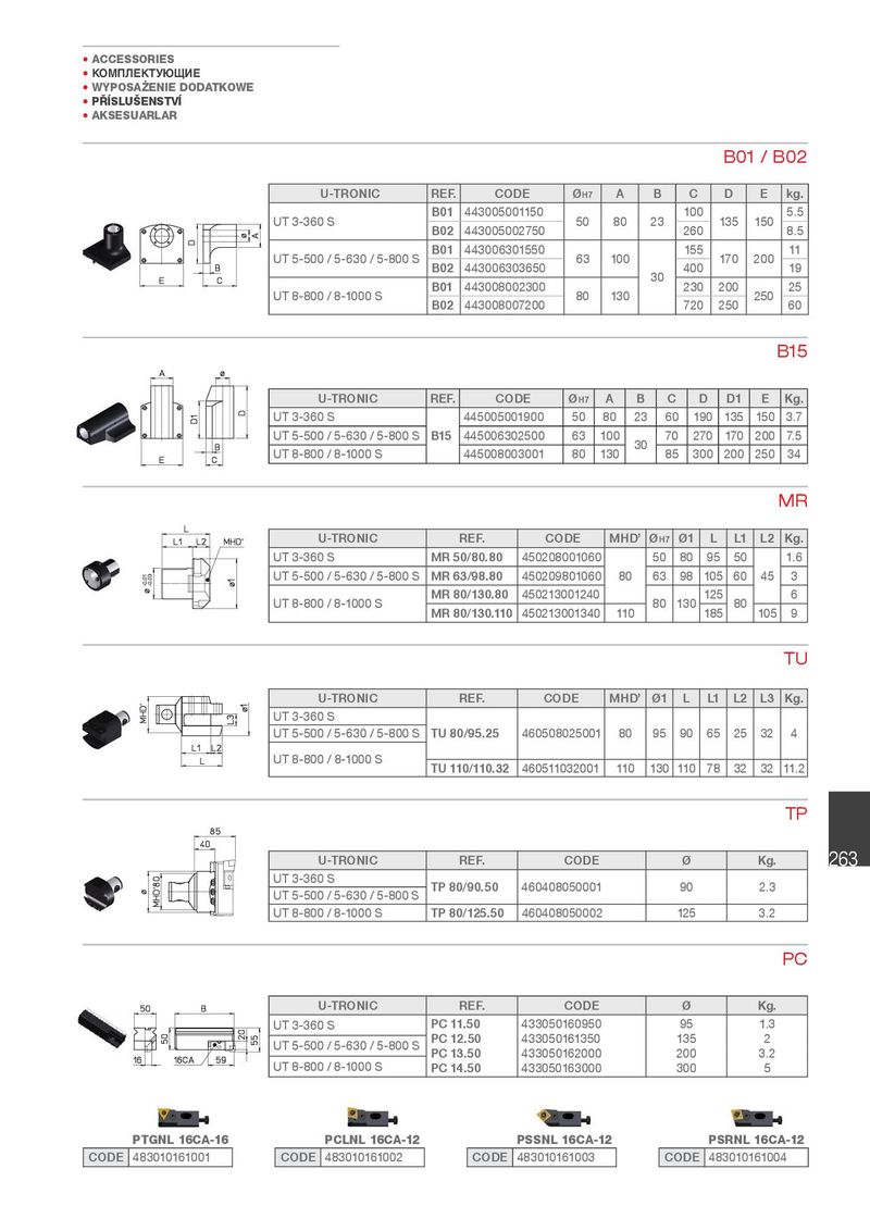 • ACCESSORIES • КОМПЛЕКТУЮЩИЕ • WYPOSA¾ENIE DODATKOWE • P¢ SLU¦ENSTV • AKSESUARLAR B01 / B02 U-TRONIC REF. CODE ØH7 A B C D E kg. UT 3-360 S B01 443005001150 50 80 23 100 135 150 5.5 B02 443005002750 260 8.5 876 B01 443006301550 63 100 155 170 200 11 B02 443006303650 30 400 19 876 B01 443008002300 80 130 230 200 250 25 B02 443008007200 720 250 60 B15 U-TRONIC REF. CODE ØH7 A B C D D1 E Kg. UT 3-360 S 445005001900 50 80 23 60 190 135 150 3.7 876 B15 445006302500 63 100 30 70 270 170 200 7.5 876 445008003001 80 130 85 300 200 250 34 MR U-TRONIC REF. CODE MHD’ ØH7 Ø1 L L1 L2 Kg. UT 3-360 S MR 50/80.80 450208001060 50 80 95 50 1.6 876 MR 63/98.80 450209801060 80 63 98 105 60 45 3 876 MR 80/130.80 450213001240 80 130 125 80 6 MR 80/130.110 450213001340 110 185 105 9 TU U-TRONIC REF. CODE MHD’ Ø1 L L1 L2 L3 Kg. UT 3-360 S 876 TU 80/95.25 460508025001 80 95 90 65 25 32 4 876 TU 110/110.32 460511032001 110 130 110 78 32 32 11.2 TP U-TRONIC REF. CODE Ø Kg. 263 UT 3-360 S TP 80/90.50 460408050001 90 2.3 876 876 TP 80/125.50 460408050002 125 3.2 PC U-TRONIC REF. CODE Ø Kg. UT 3-360 S PC 11.50 433050160950 95 1.3 876 PC 12.50 433050161350 135 2 PC 13.50 433050162000 200 3.2 876 PC 14.50 433050163000 300 5 PTGNL 16CA-16 PCLNL 16CA-12 PSSNL 16CA-12 PSRNL 16CA-12 CODE 483010161001 CODE 483010161002 CODE 483010161003 CODE 483010161004